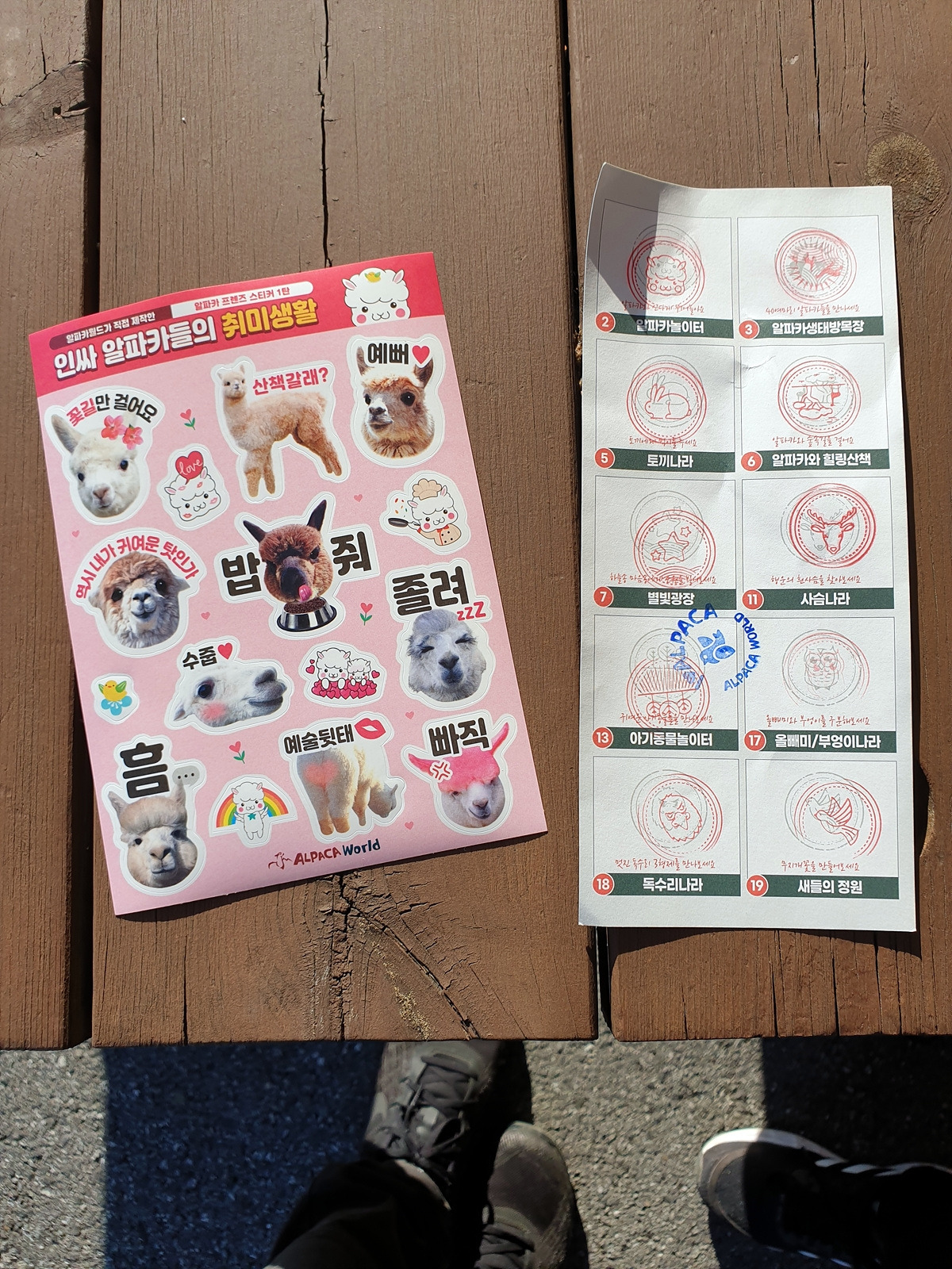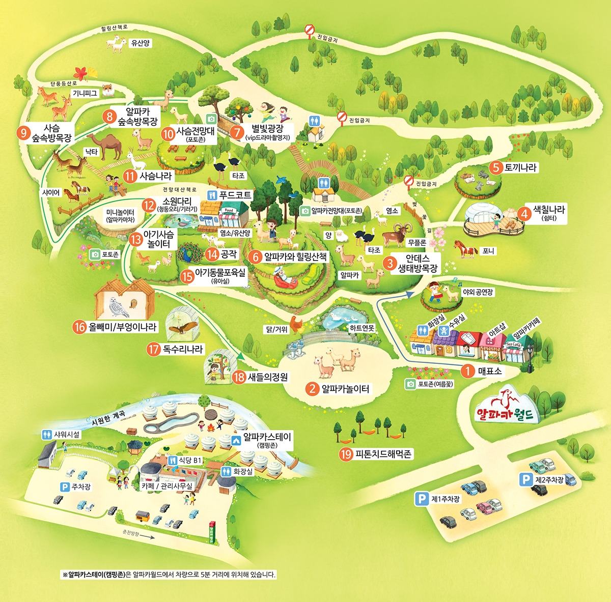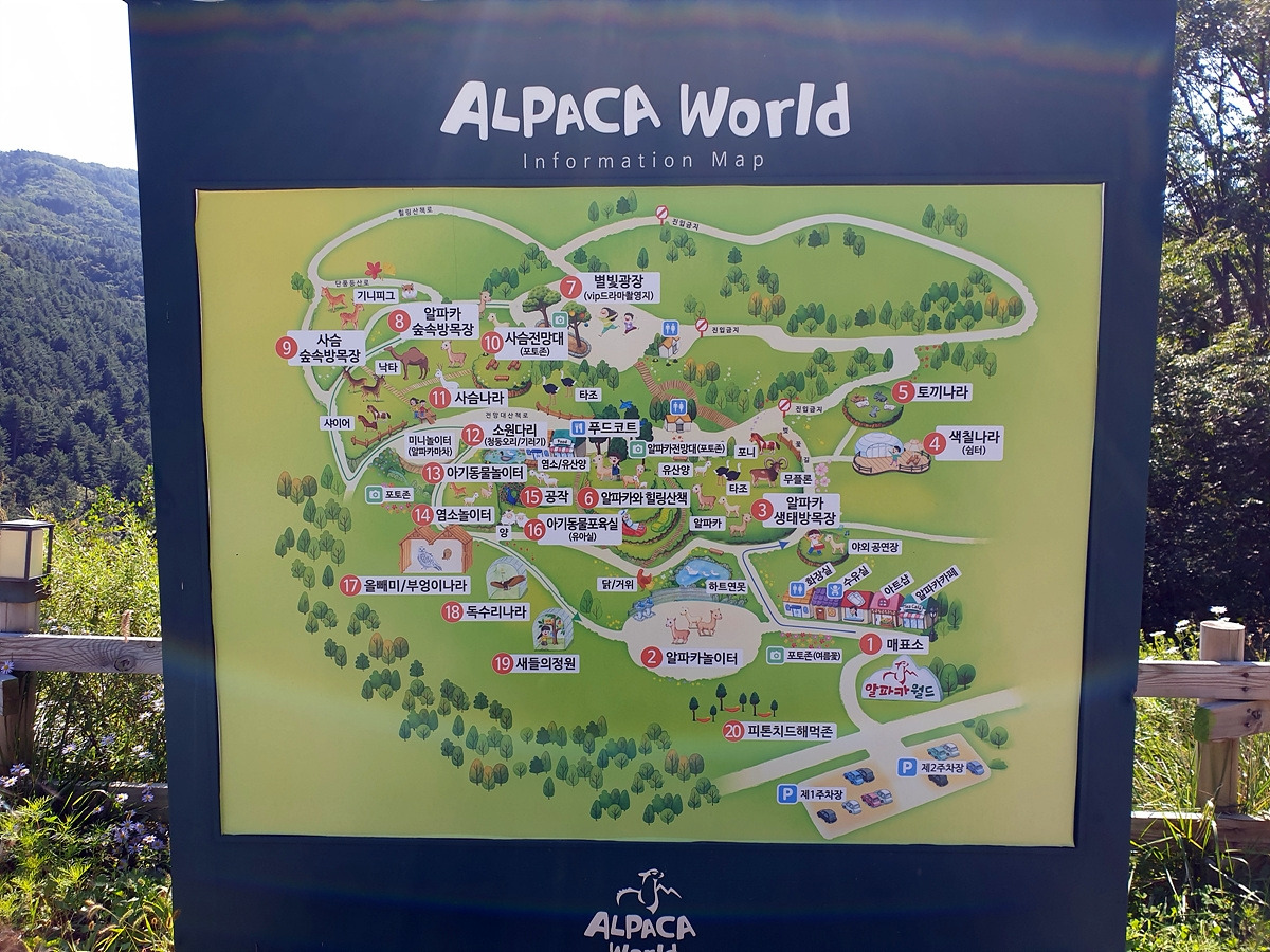 근처에 알파카 월드 지도가 있다. 티켓 부스 옆에도 안내책자가 있는데 전체 지도에 번호가 붙어있다. 가능하면 이 번호대로 둘러보는 것을 추천한다. 둘러보기 가장 좋은 순서대로 구성을 해놓은 것이라 번호만 따라 가면 전체를 구경할 수 있다. 스탬프 투어도 있어 모든 곳을 방문하면서 스탬프를 찍어오면 기념품도 있다고 한다.