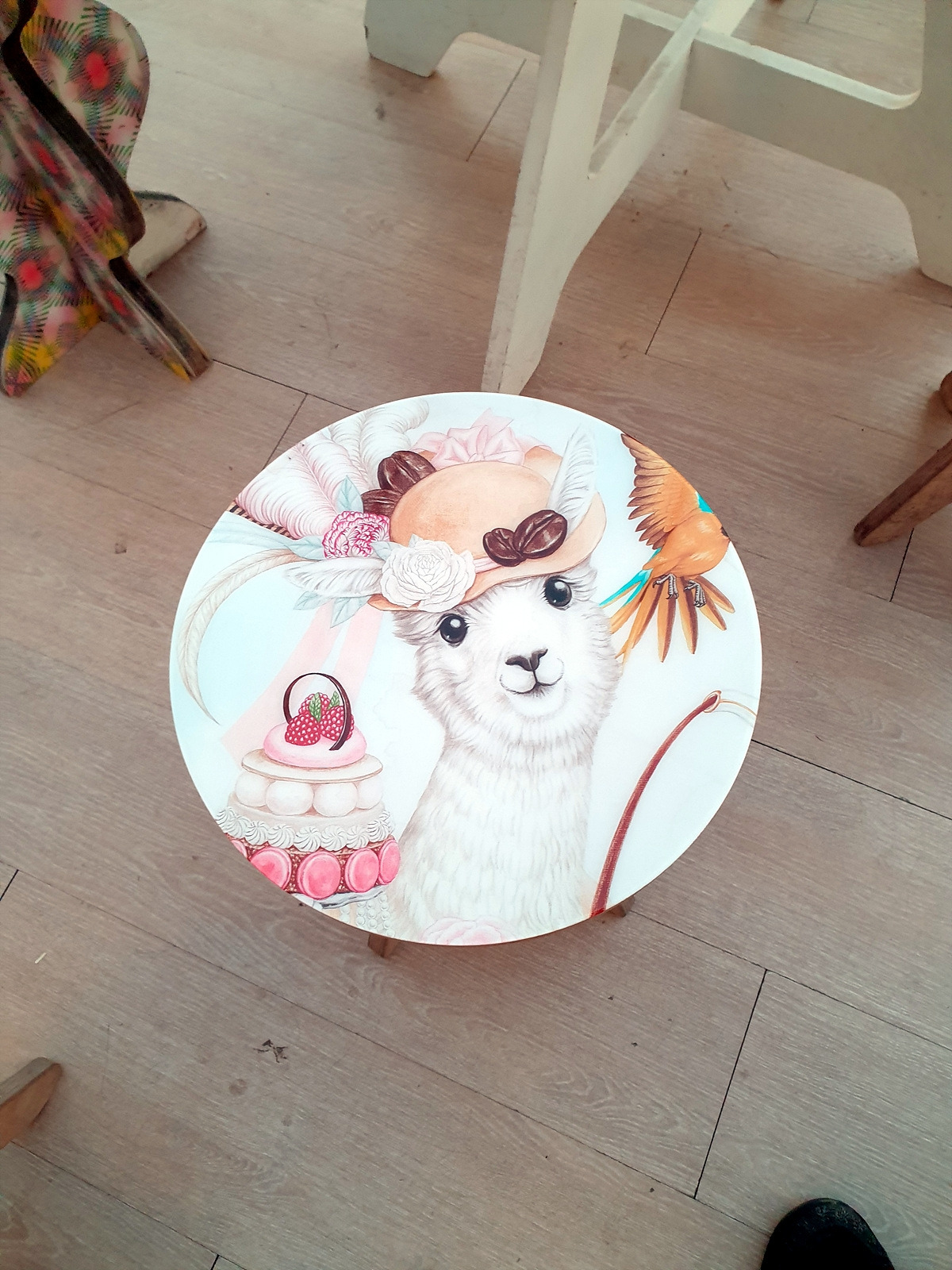 알파카가 그려진 의자에 앉아서 색연필로 알파카 엽서에 색칠을 해서 벽면에 달아둘 수 있다.