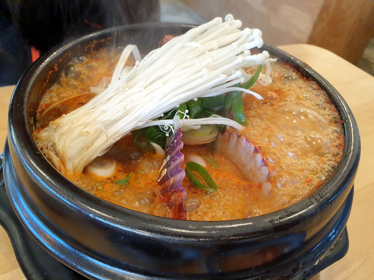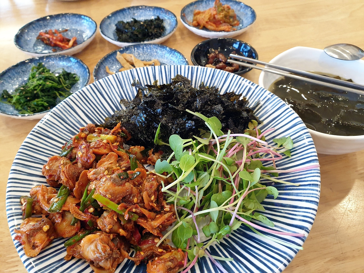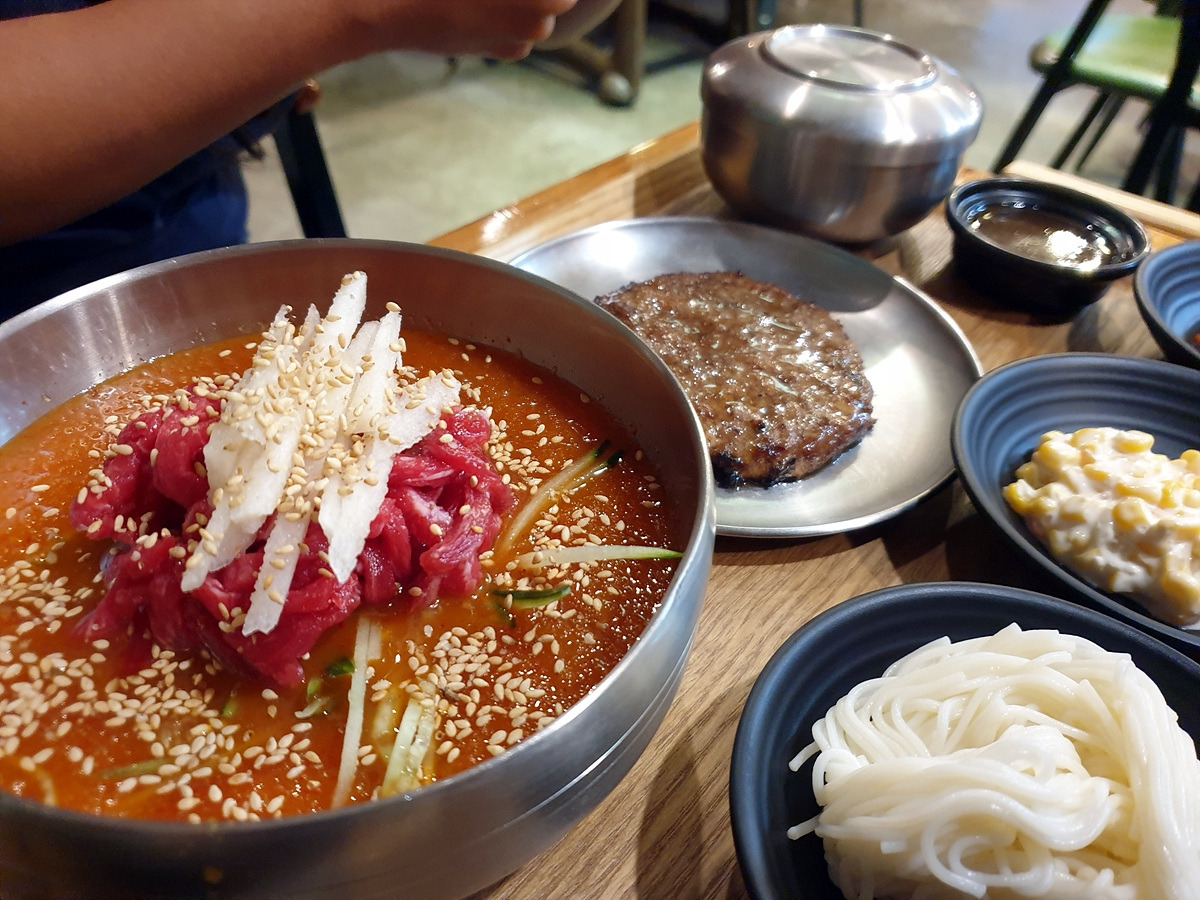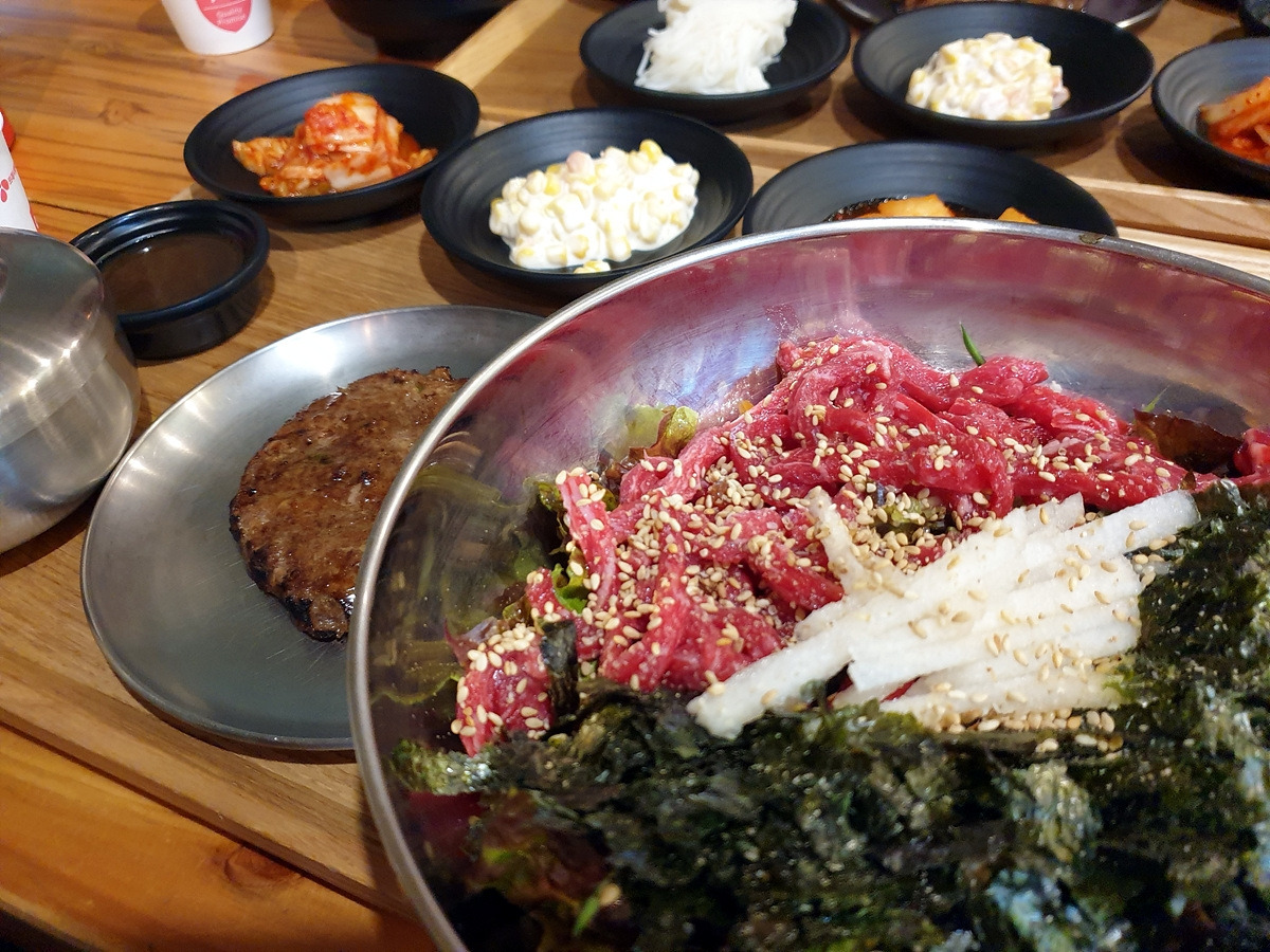 강문해변 뒤쪽 골목에 육회 비빔밥과 육회 물회를 파는 식당이 있어 저녁을 먹기로 했다.큰 기대 없이 갔는데 생각보다 맛있다.
