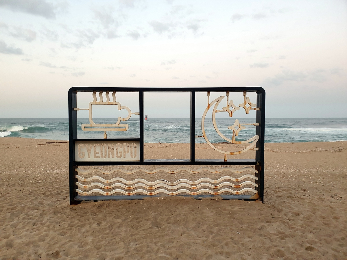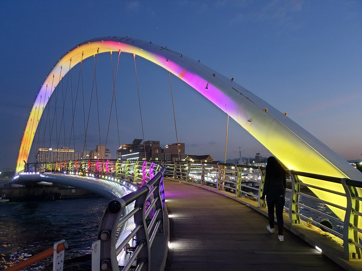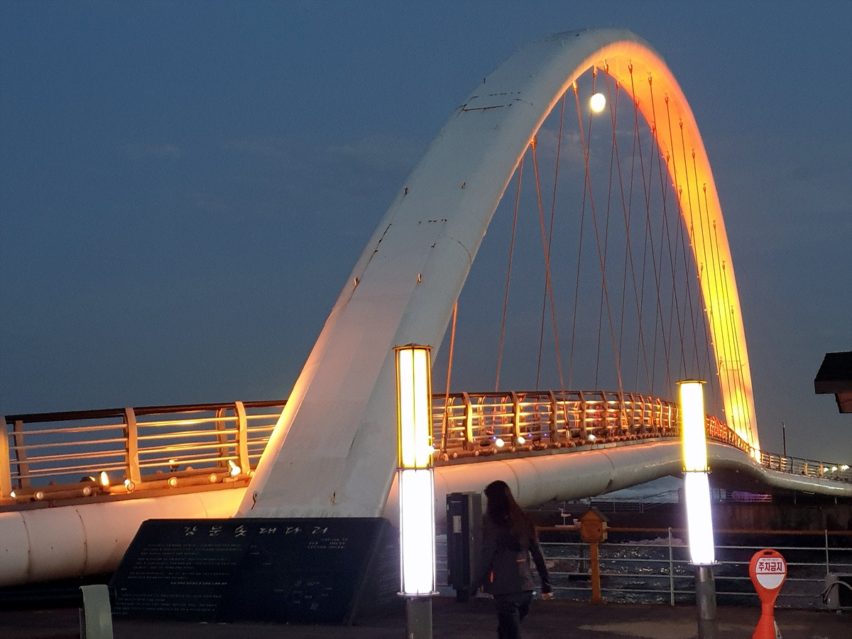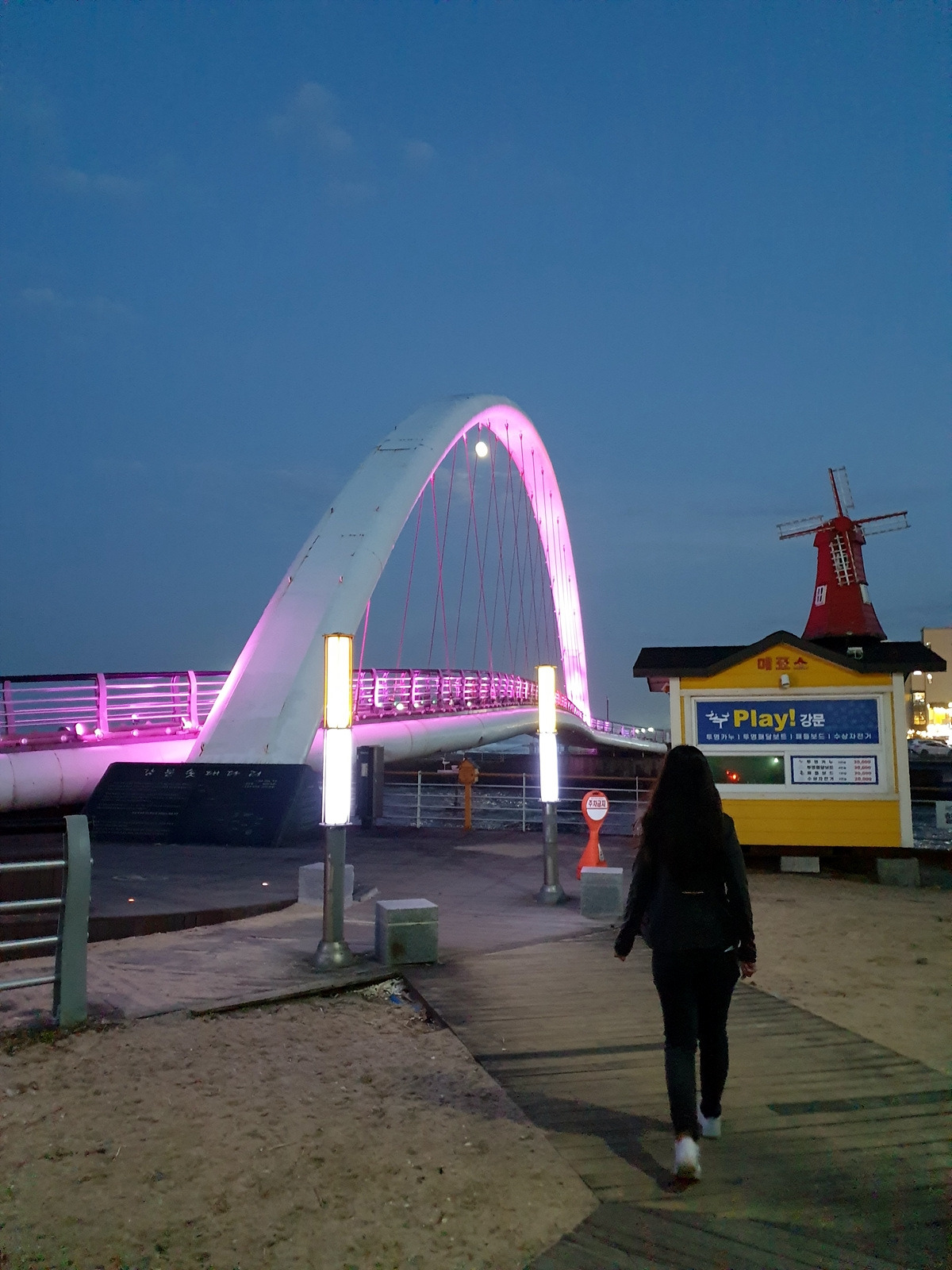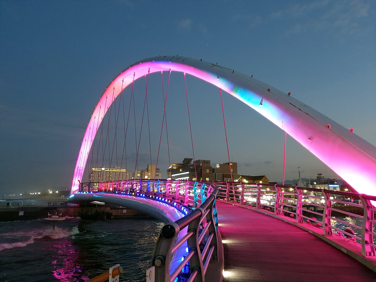 경포해변의 끝에 멋진 다리가 있다. 강문 솟대다리다. 동해안 자전거길을 달릴 때는 여길 지나갈 일이 없으니 처음 보는 것 같다. 색이 서서히 변하는 게 멋지다.