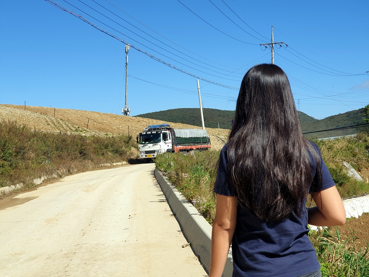 차만 지나가면 흙먼지가 뿌옇게 일어나는데 배추를 가득 실은 트럭이 저 앞부터 속도를 줄여서 살살 지나간다. 보행자에 대한 운전기사님의 배려가 고맙다.