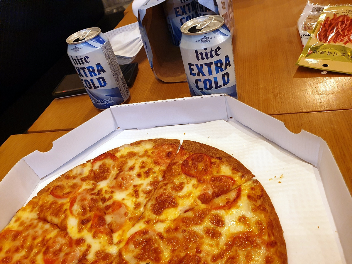 울릉도에도 피자 가게가 하나 있는데 그것도 바로 숙소 앞이라서 한 판 사다가 맥주를 곁들여 저녁을 먹는다. 우리 동네에 잘 하는 피자집이 많아서 그보다는 질이 떨어지는데 울릉도에서 먹는다는게 어딘가.