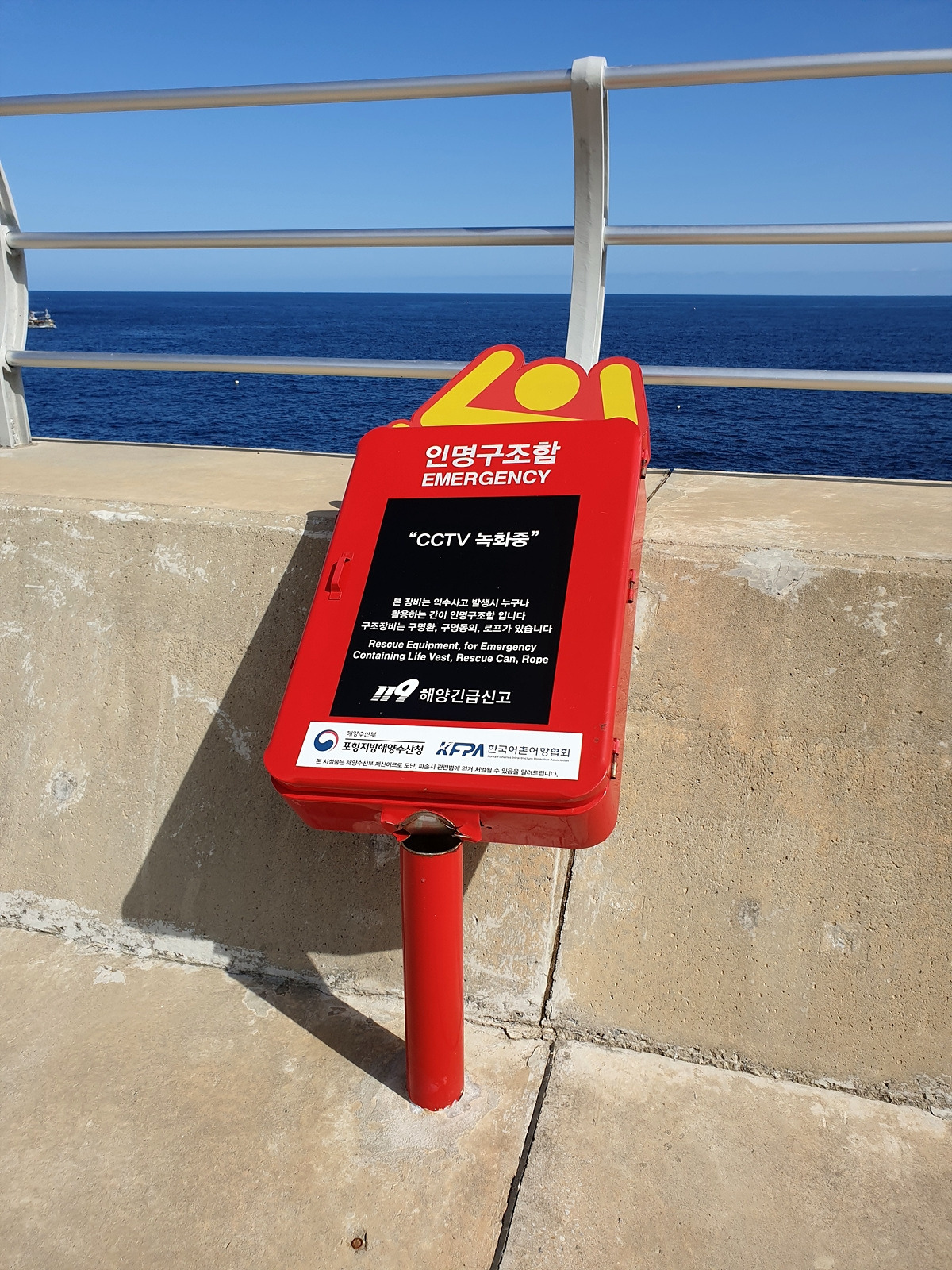 방파제의 인명구조함이 꺾여 쓰러져 있다. 이번 태풍의 흔적인가보다.