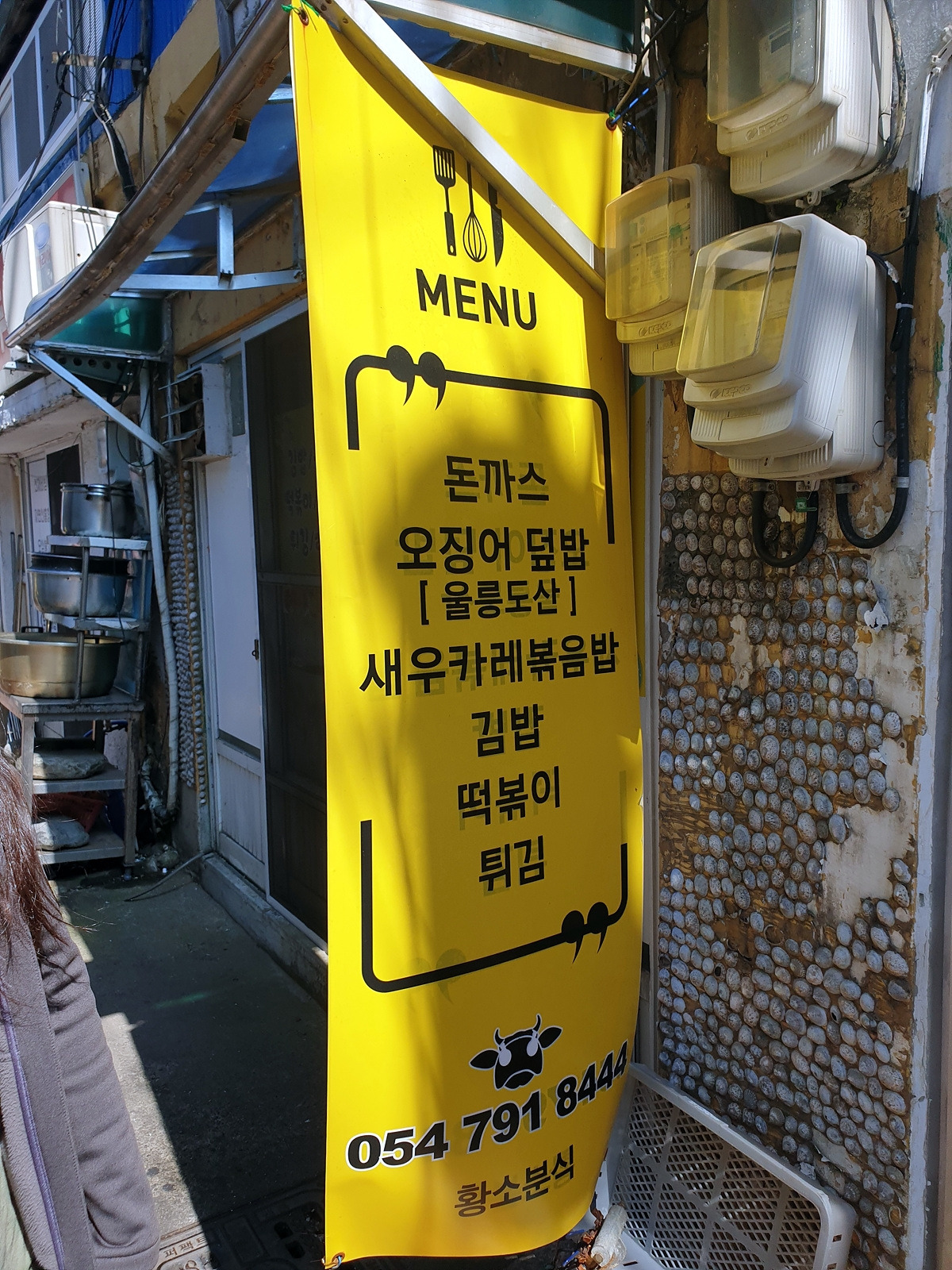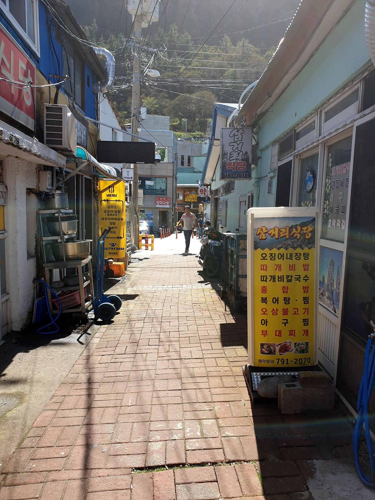울릉도는 지형이 험해서 사람이 살 수 있는 땅이 많지 않다. 대부분 바닷가 쪽 골짜기에 모여 사는데 마을들이 그리 크지 않다.여객터미널에서 빠져나가면 바로 근처에 식당 골목이 있다. 오징어 내장탕과 따개비밥 같은 걸 많이 판다.