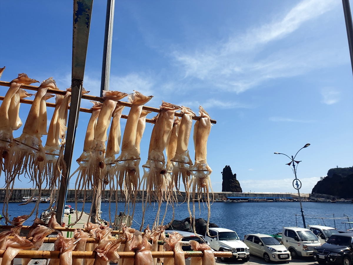 저동항의 상징은 촛대바위다. 말리는 오징어 뒤로 촛대바위가 보인다.