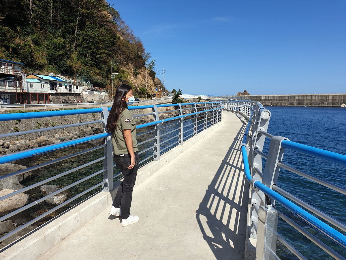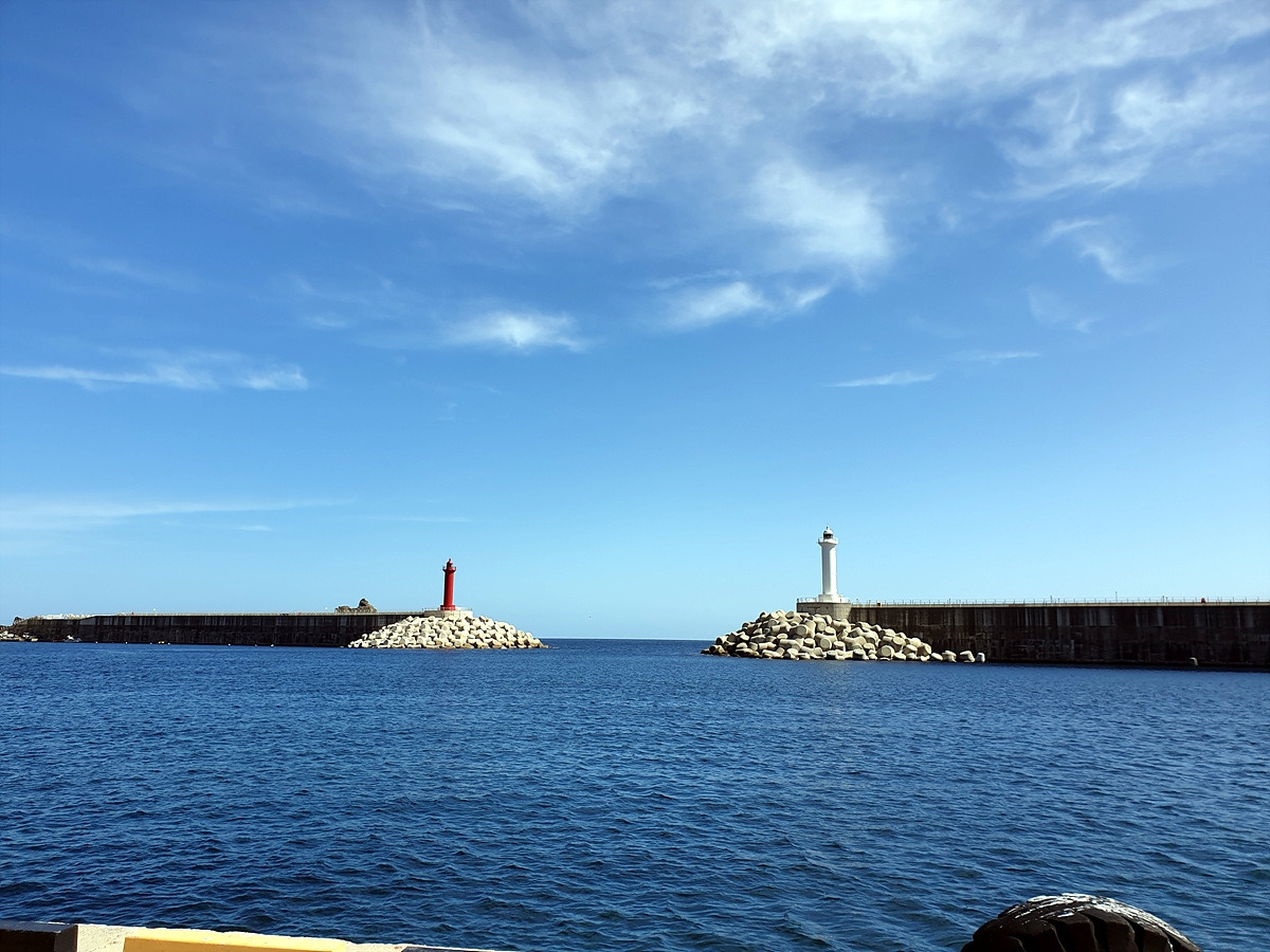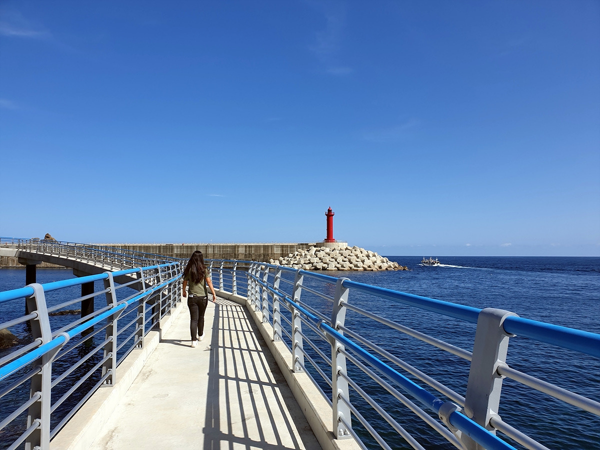 저동항의 북쪽 끝인 빨간 등대 쪽으로 가본다. 방파제까지는 해안 산책로가 만들어져 있는데 방파제부터는 좁은 도로 밖에 없다. 좁은 도로 가를 걷는 것은 그리 좋은 방법이 아니니 방파제로 올라가본다.