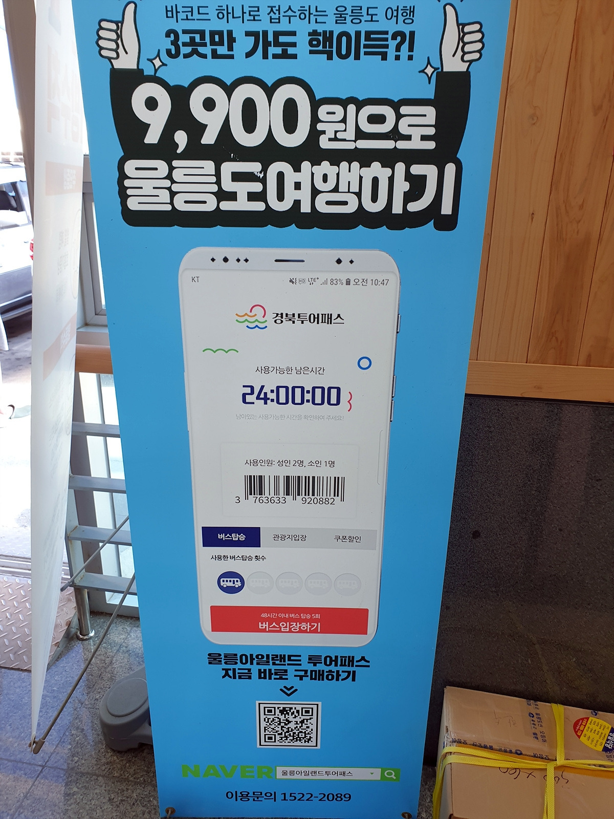 터미널 화장실에 잠시 들르는데 뭔가가 보였다. 울릉아일랜드 투어패스... 찾아보니 가장 비싼 24,000원 짜리 표를 구입하면 사용 시작 시간부터 48시간 동안 관광지 6곳과 버스 무제한 탑승이 가능하다고 하니 구입해둔다.