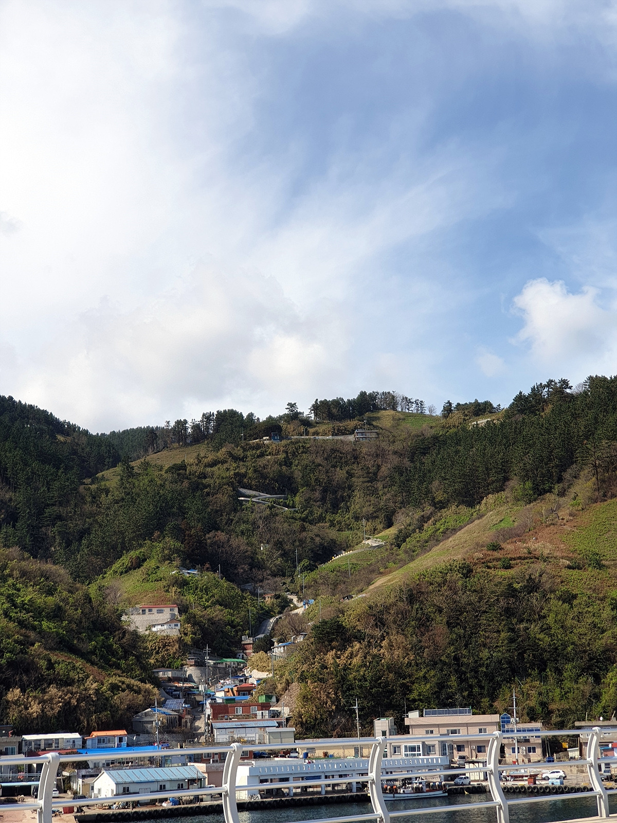 빨간 등대 근처의 벤치에 앉아서 저동을 구경한다. 울릉도는 마을을 벗어나면 바로 가파른 산이다. 어떻게든 도로를 산 위로 연결해서 산에도 사람들이 산다.경사가 심한 도로에 눈비도 많이 오는 곳이니 사고도 많을 것 같다.