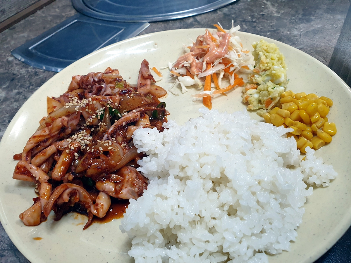 일단 오징어 요리를 먹자! 하고 적당한 식당에 들어가서 오징어 덮밥을 한 그릇 먹는다.
