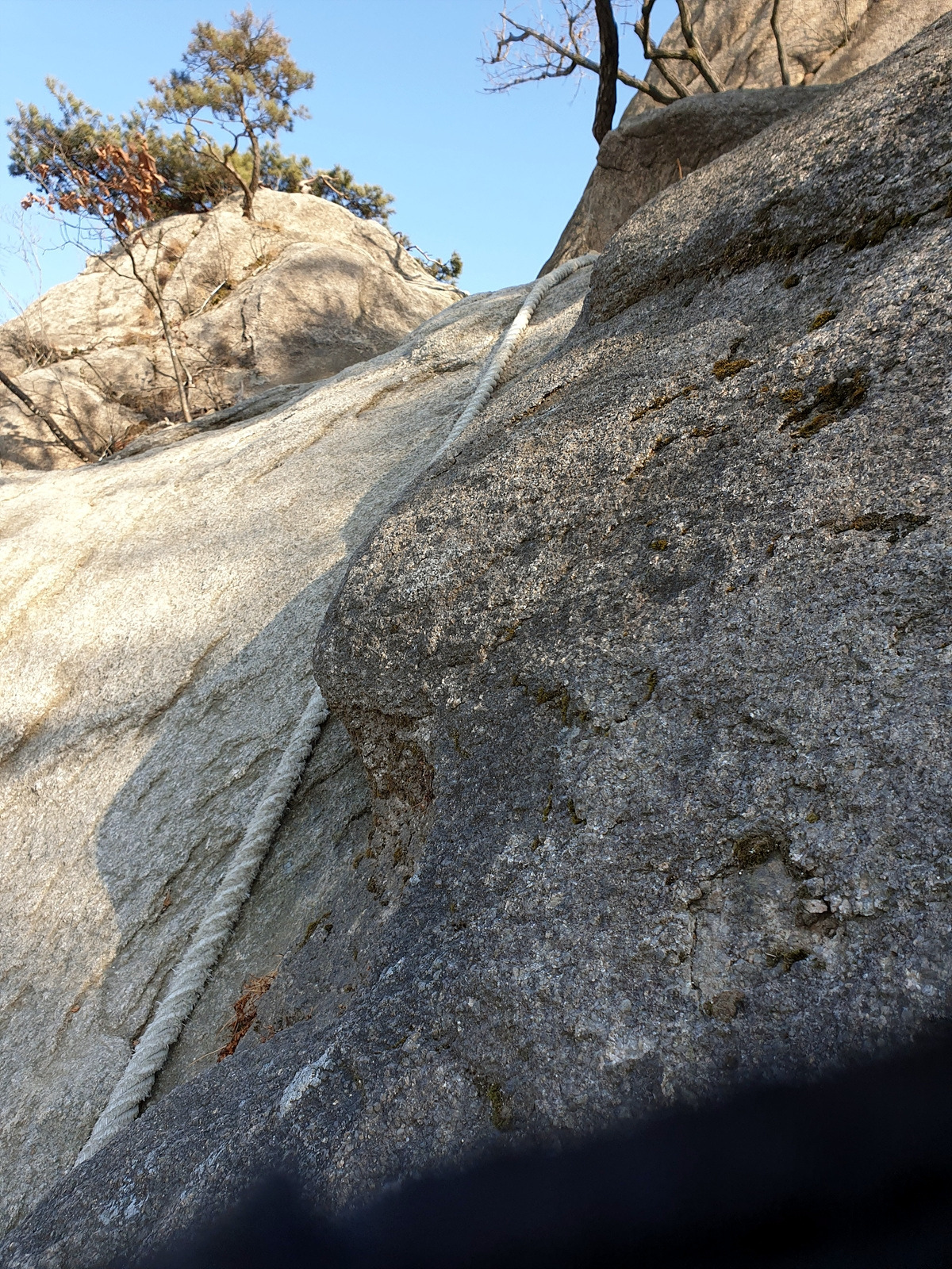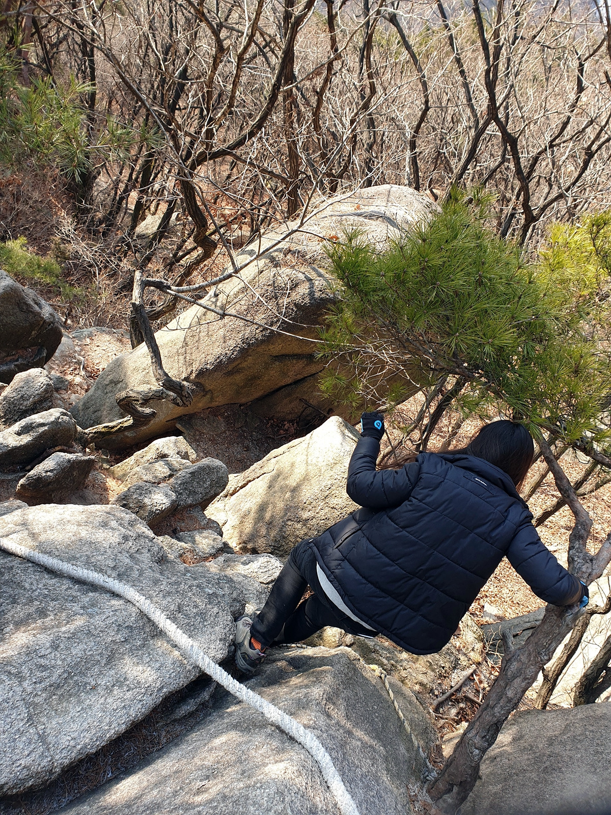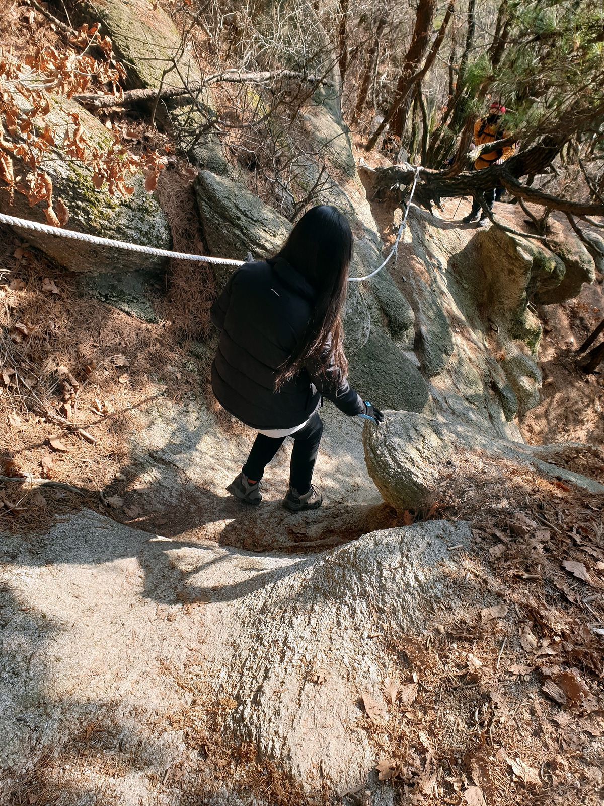 내려가는 길도 가능하면 사람 없는 곳으로 내려간다. 역시나 내려갈 때도 밧줄을 잡고 내려가야 하는 곳이 있다.
