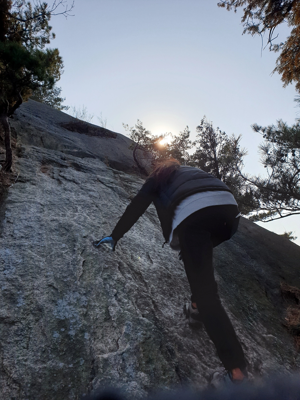 밧줄도 없는 절벽이 나타났다. 기어올라가니 조망이 좋아진다.