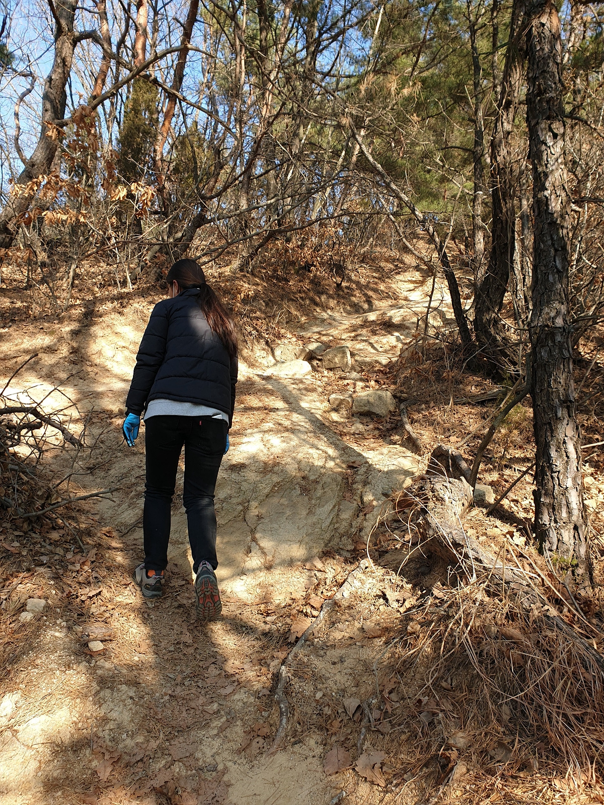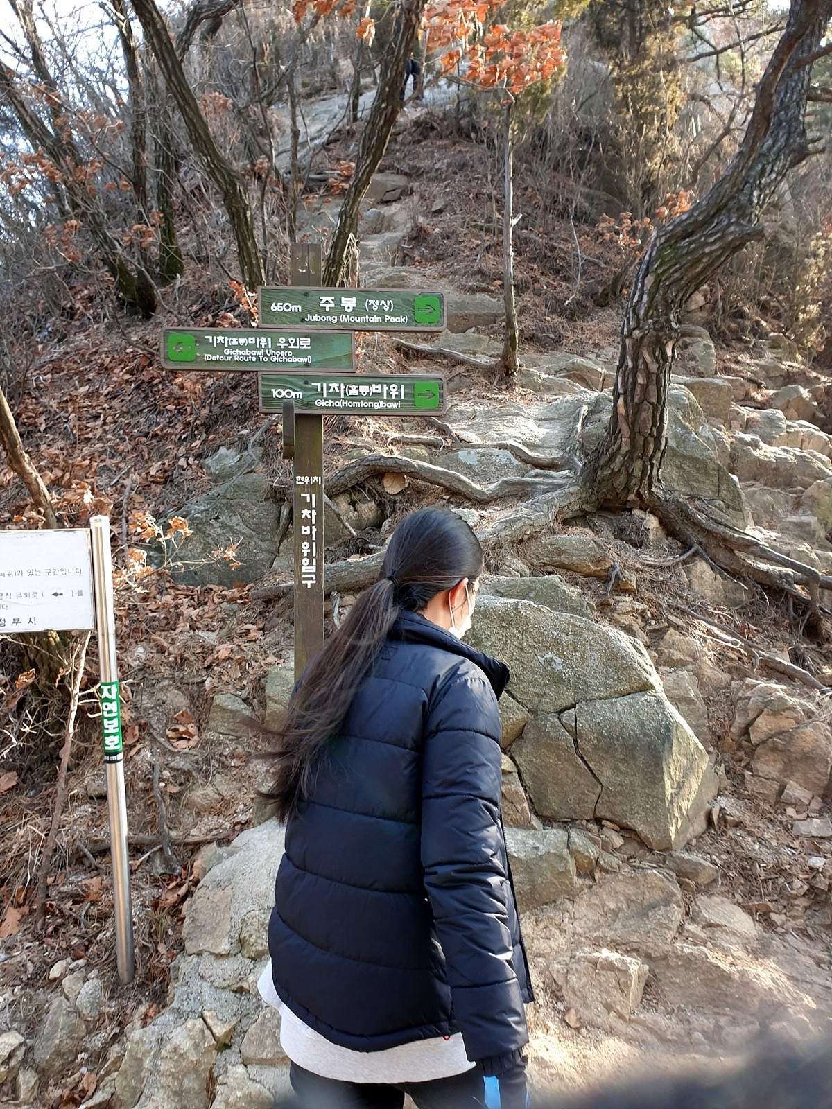 올라가는 길은 바위를 기어 올라가야 하는 곳이 여럿 있었는데 내려가는 길에도 바위를 기어 내려가야 하는 곳이 몇 군데 있는 급경사 길이다. 근처에 갈래길이 있는지 사람 소리는 가끔 들리는데 사람은 안 보인다.