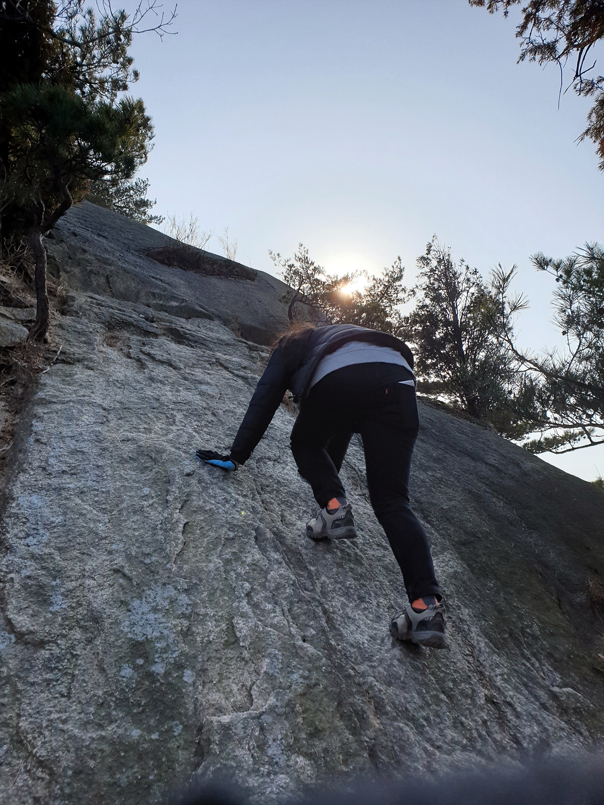 첫 번째 능선에 올라왔다. 지금까지 계곡 바위 위를 올라왔다면 이제부터는 봉우리로 가는 커다란 바위를 기어올라야 한다.