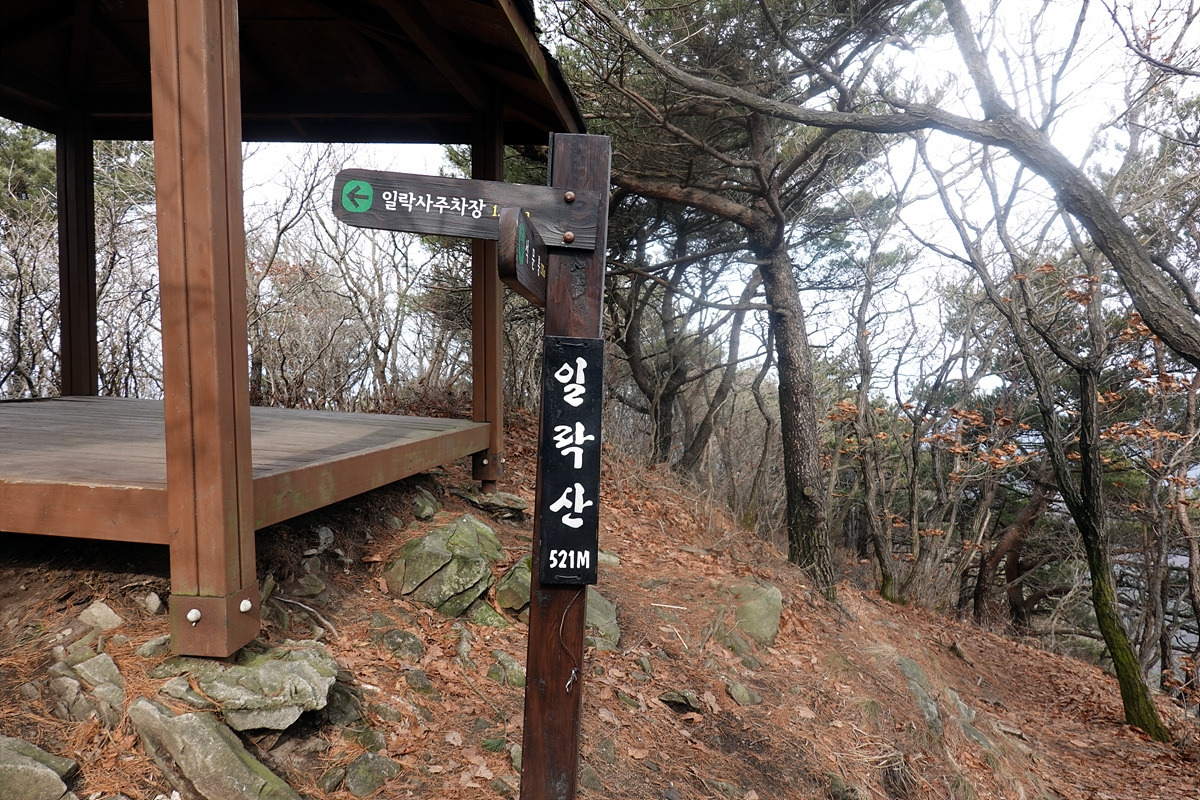 돌계단을 또 올라가면 1차 통과지점인 일락산 정상 정자에 도착한다. 정상이라지만 숲으로 둘러싸여 조망이 제한적이다.