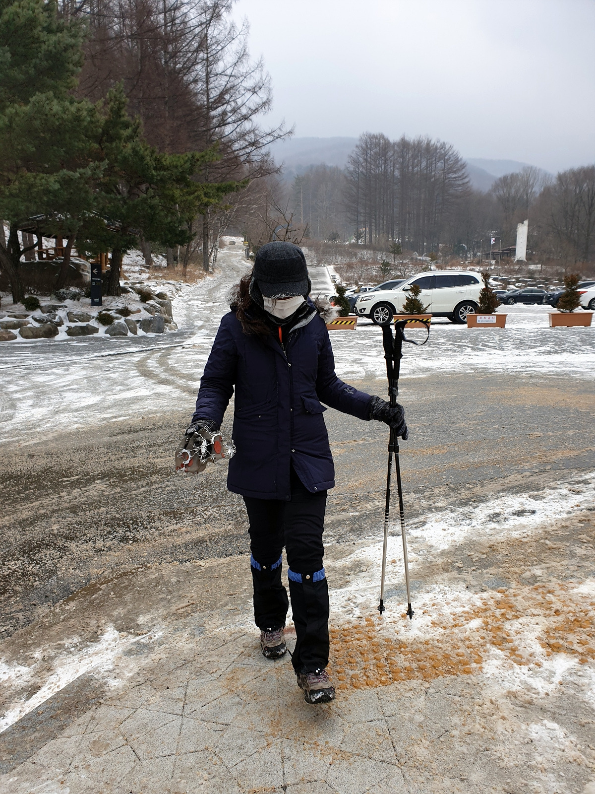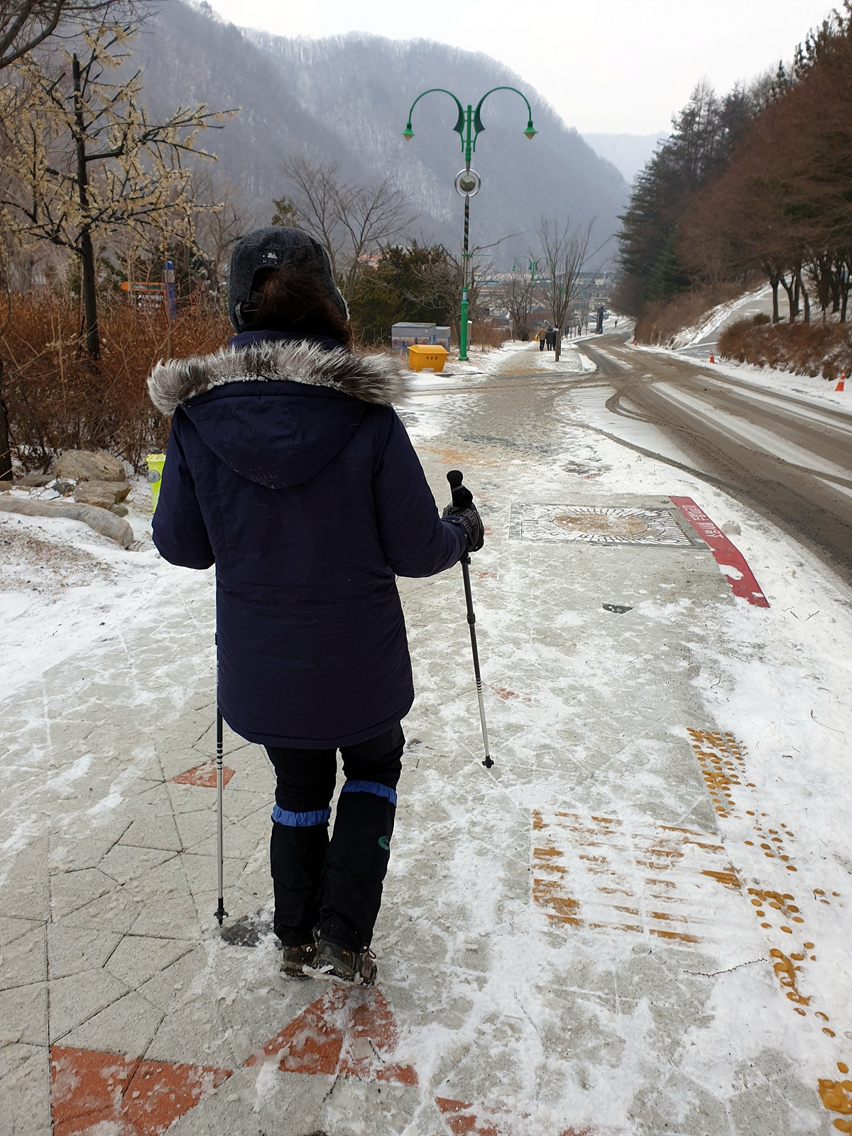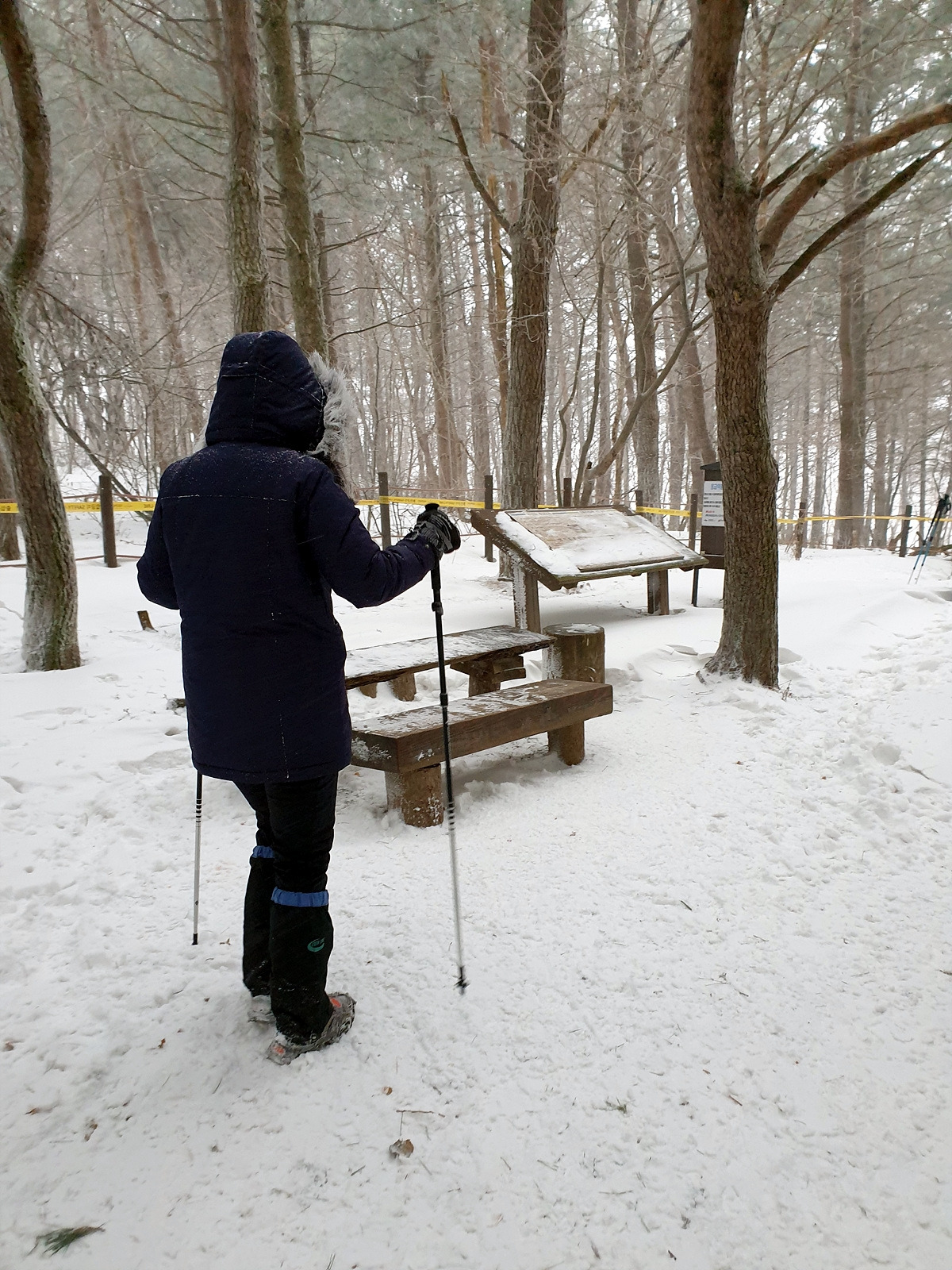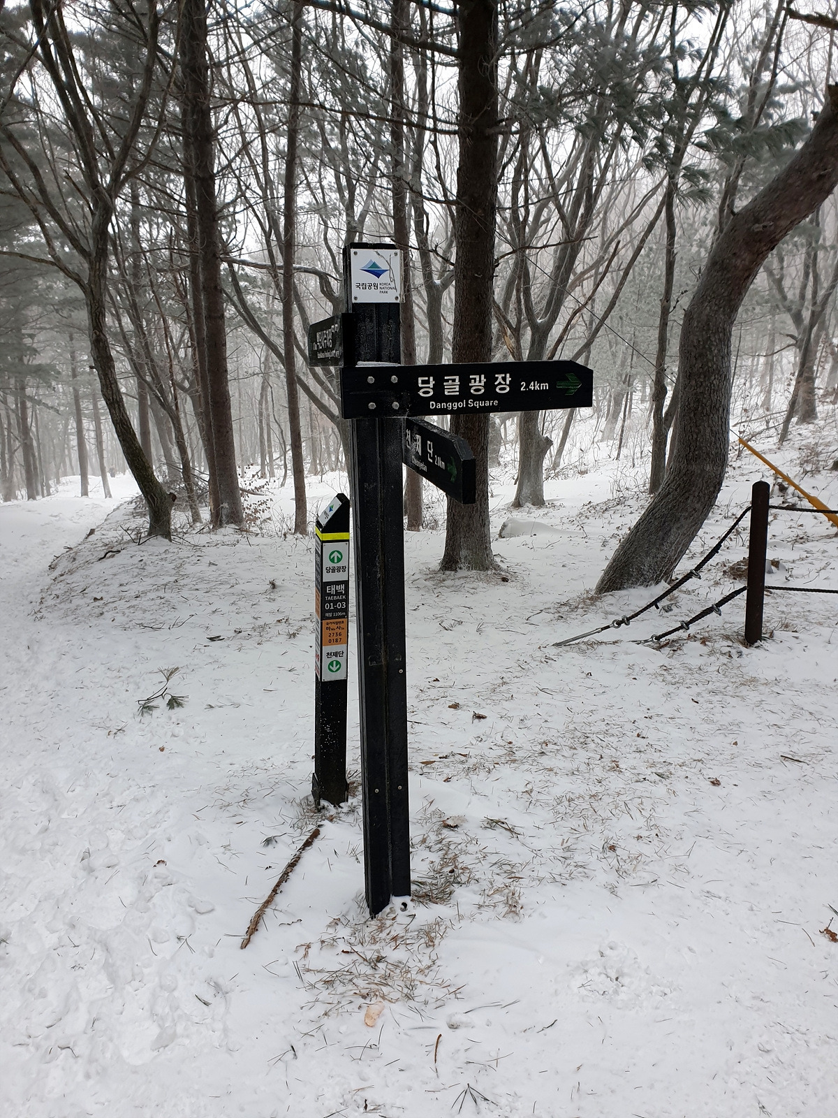 이제 거의 다 왔으니 아이젠도 벗는다. 마침 공원 직원들이 보행로에 제설작업을 해놓은 덕분에 그냥 걸어도 부담이 없다. 원래 이 당골광장이 해마다 눈꽃축제가 펼쳐지던 곳이었는데 올해는 태백산을 찾는 등산객들 외에는 조용하다.