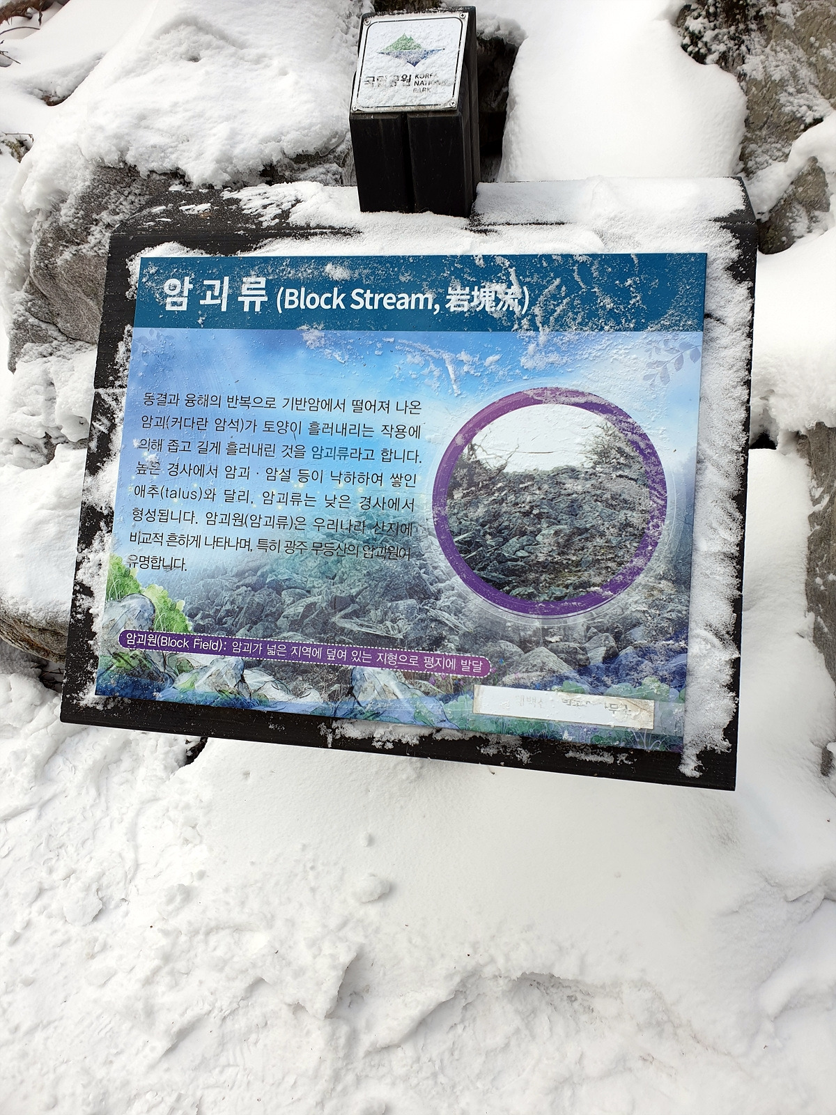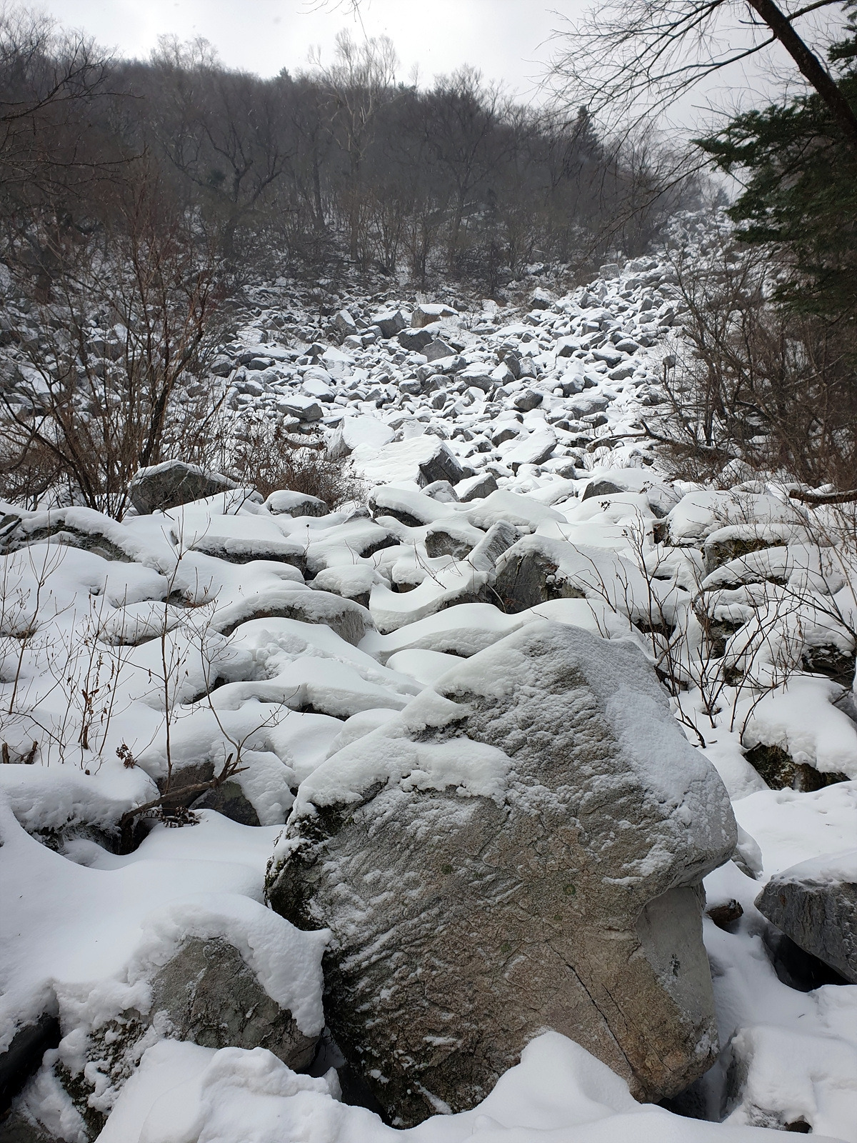 너덜바위 지대도 보인다. 한자로는 암괴류라고 한다. 이 암괴류는 우리나라 산에서 흔히 볼 수 있고 등산로 중에는 이런 너덜바위를 통과하는 길도 있다.