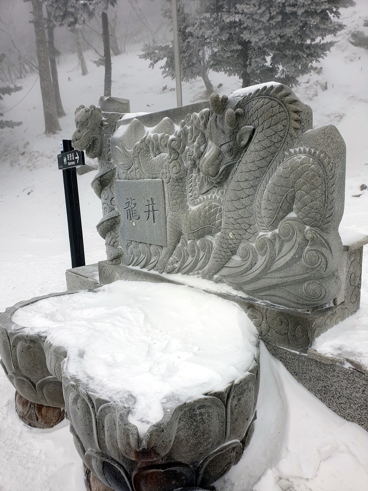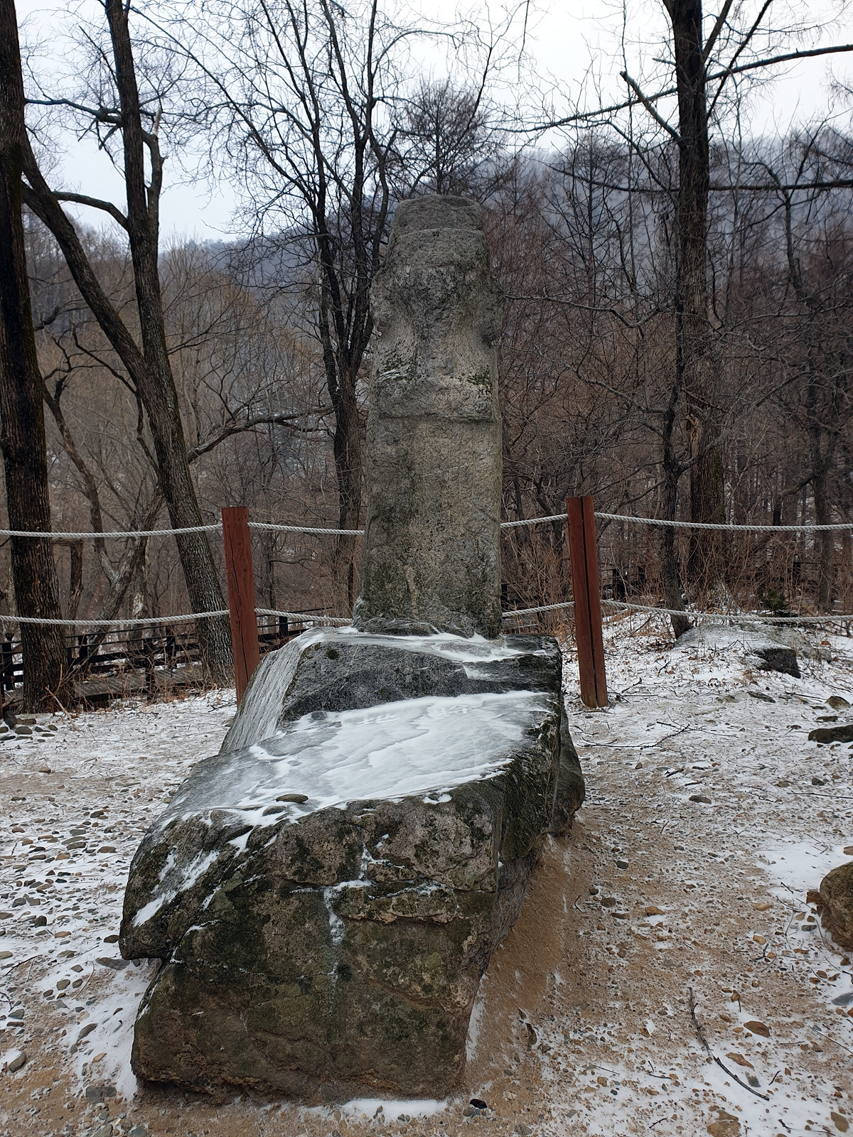 흐리고 눈이 내려서 시야가 막힌 듯한 느낌으로 등산로를 계속 걸어가니 제단이 하나 나타난다. 태백산에는 제단이 3개 있다고 하는데 그중에 하나인 장군봉의 장군단이다.