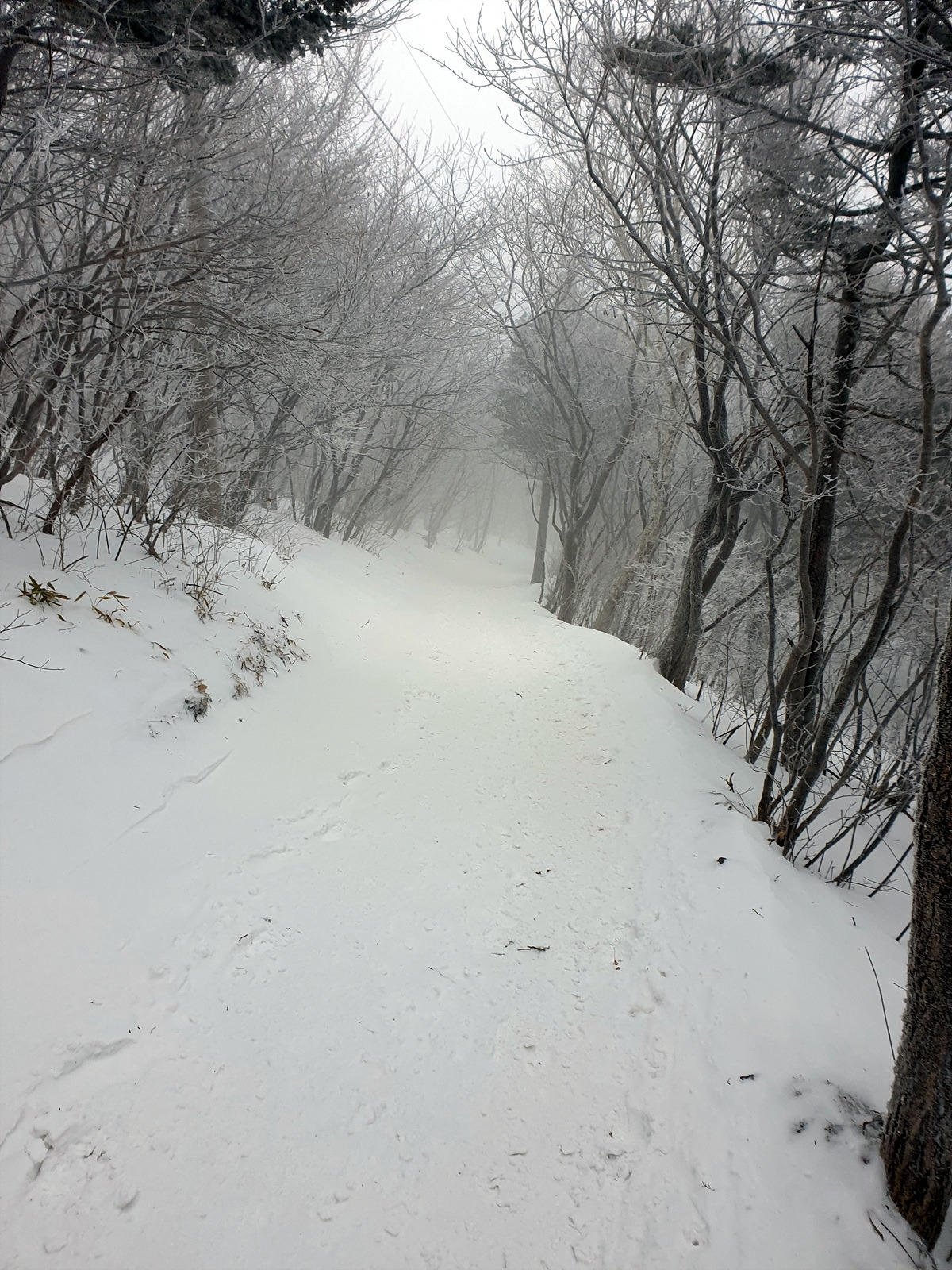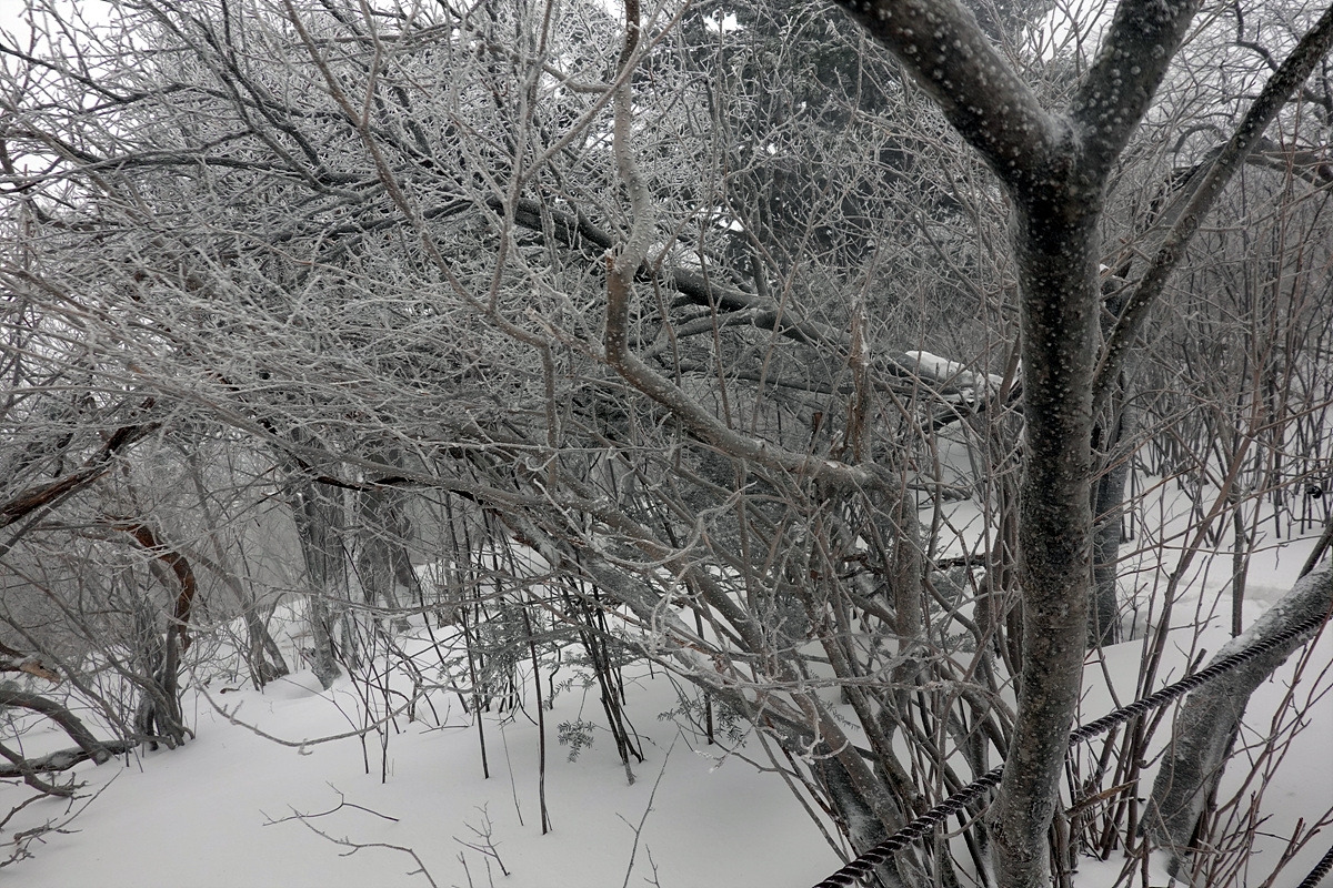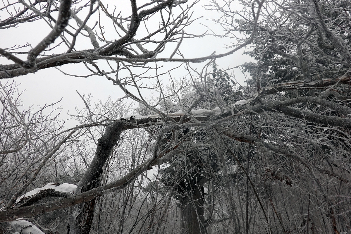 본격적인 등산로로 들어왔지만 경사가 심하지 않아 그리 어렵지는 않다. 오히려 해발 고도가 점점 높아지면서 관목지대가 펼쳐지고 여기저기에 오래된 주목들이 서있다. 여기서부터 눈꽃이 멋지게 피어나기 시작한다. 나뭇가지가 하얗게 변해가니 환상이다.