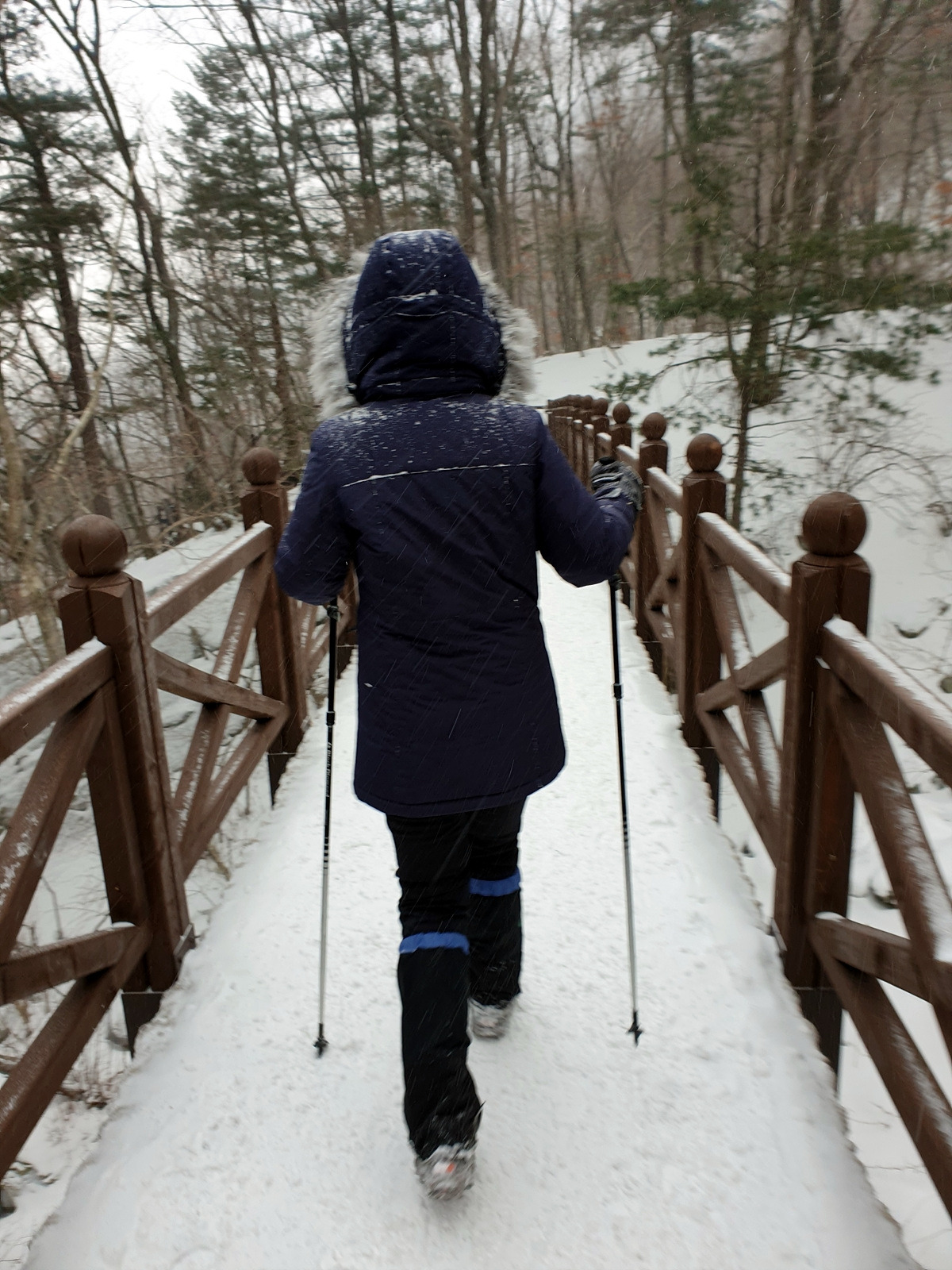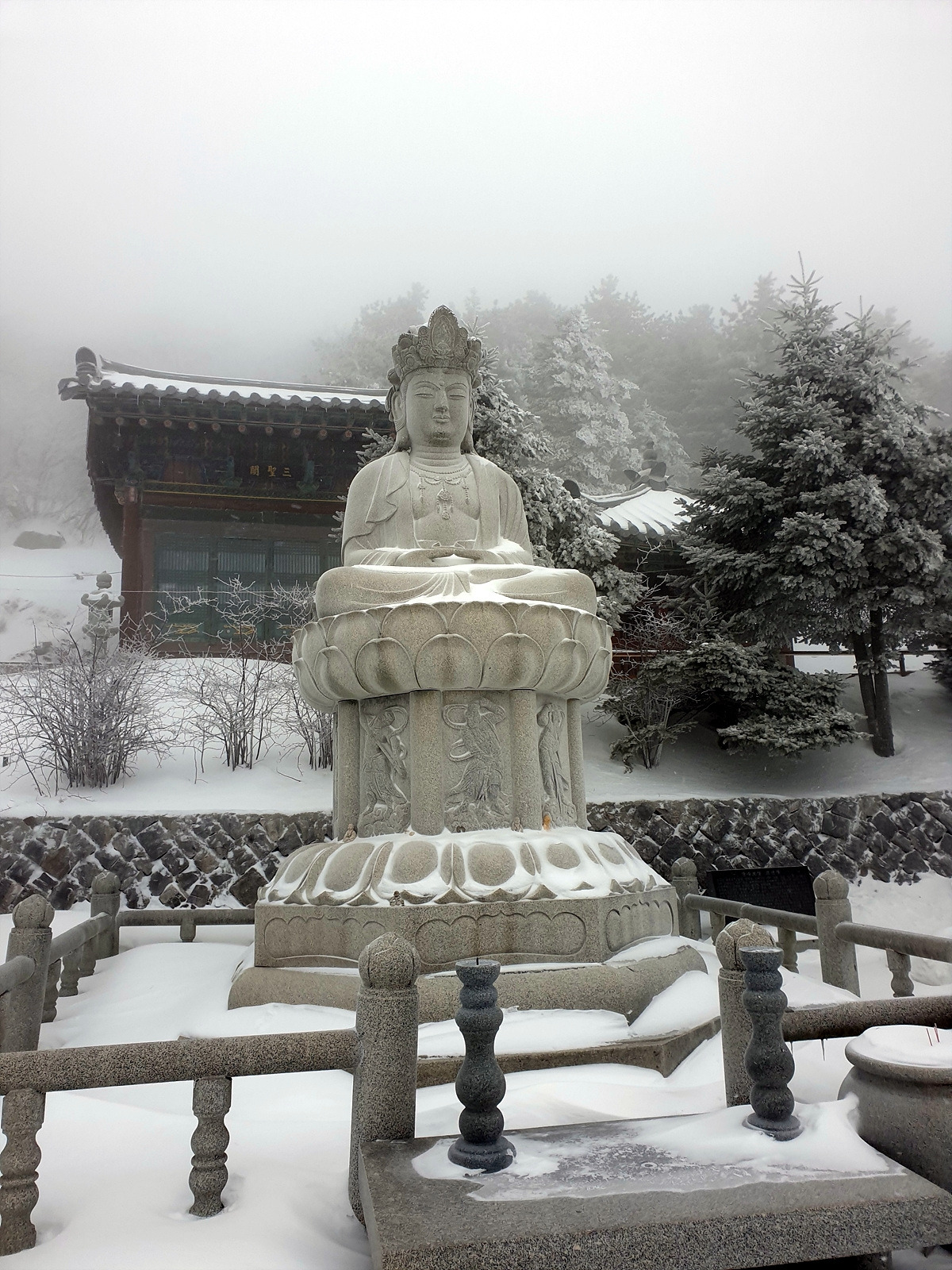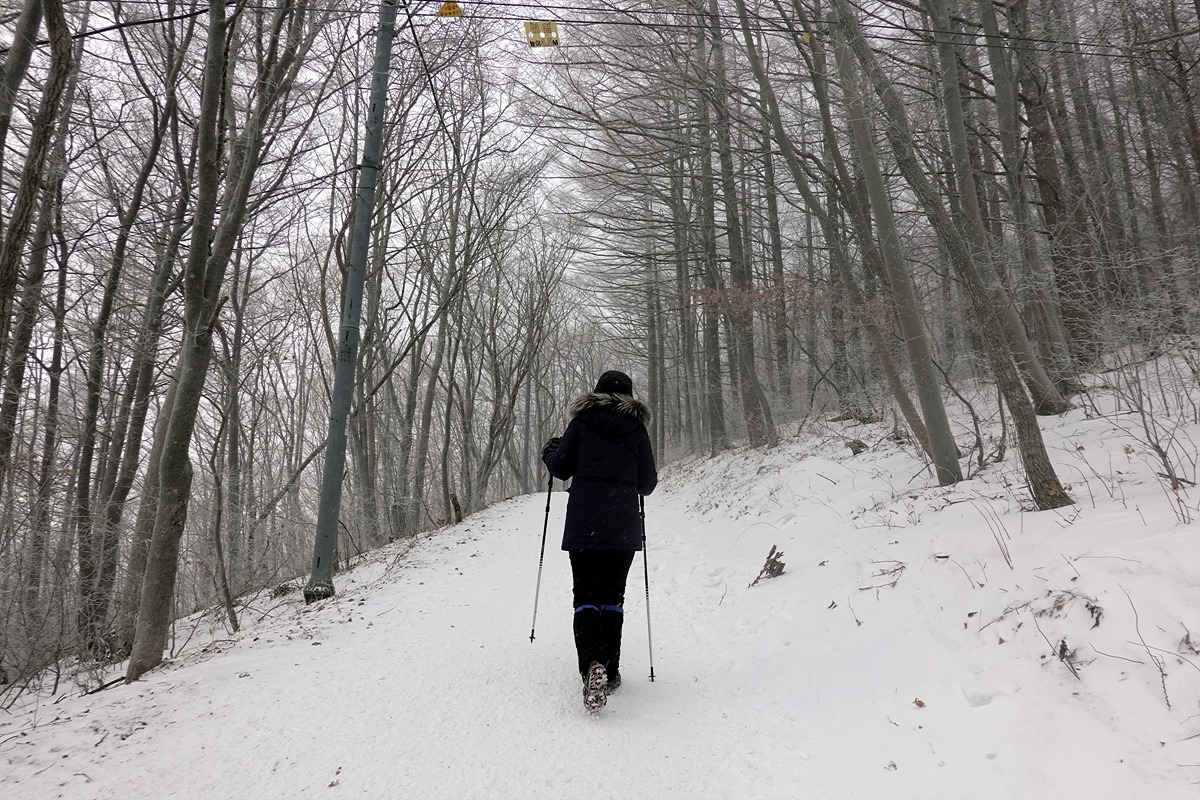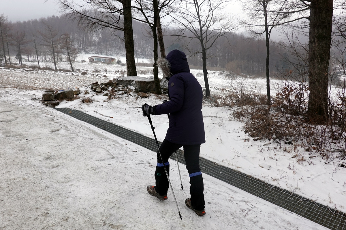 유일사까지는 완만한 시멘트 포장길이지만 길이 온통 눈으로 뒤덮여 있으니 천천히 걸어 올라간다. 날은 잔뜩 흐리고 강풍에 눈도 내리지만 단단히 준비한 덕분인지 그리 춥지는 않다.