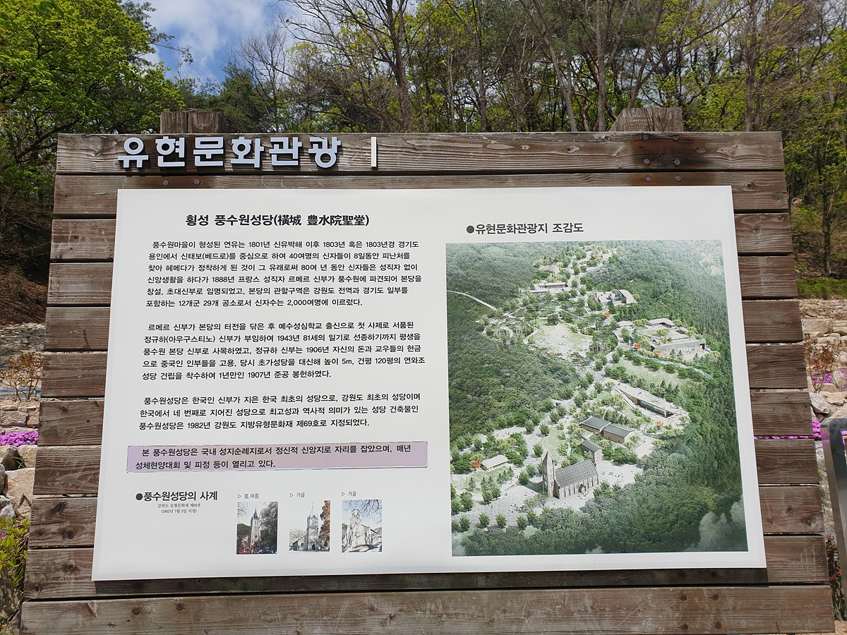 강원도 마스코트인 곰이와 횡성의 마스코트인 한우리가 그려진 조형물을 지나면 곧 인증 장소인 풍수원 성당이다.