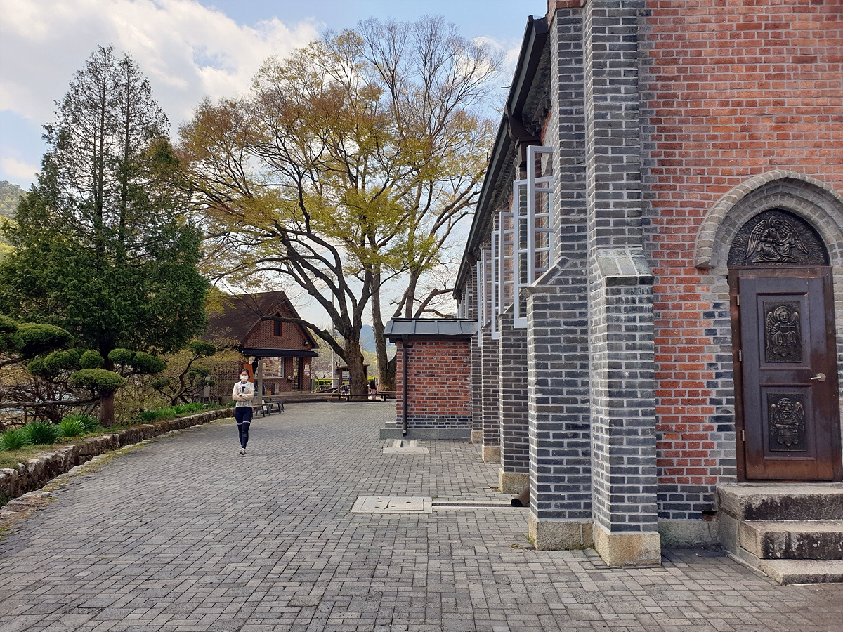 풍수원 성당이 눈에 가득 보인다. 우리나라에서 4번째로 지어진 성당이자 우리나라 사람이 지은 최초의 성당이라고 한다. 유럽의 마을마다 있는 큰 성당들에 비하면 소박한 느낌이지만 여기 사람들은 유럽 어디보다 신앙심이 깊다고 할 수 있겠다. 우리는 둘 다 종교가 없지만 이렇게 열심히 종교를 믿는 사람들은 대단한 것 같다.