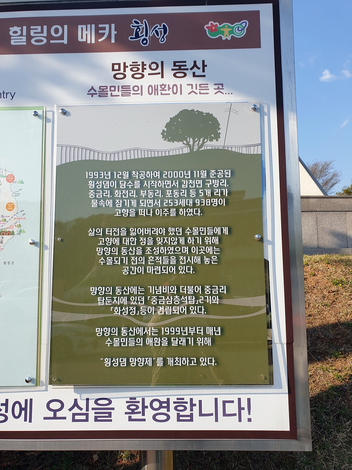 갑문과 그 부대시설 쪽은 국가 중요 시설물이라 사진 촬영 금지인데 안쪽의 횡성호수 쪽은 사진을 찍어도 괜찮다. 여기 횡성댐이 건설되면서 거대한 호수인 횡성호가 만들어졌다. 그로 인해서 여기도 몇 개의 마을이 수몰되었는데 다음 인증 목적지가 그 수몰된 마을 사람들이 만든 망향의 동산이다.