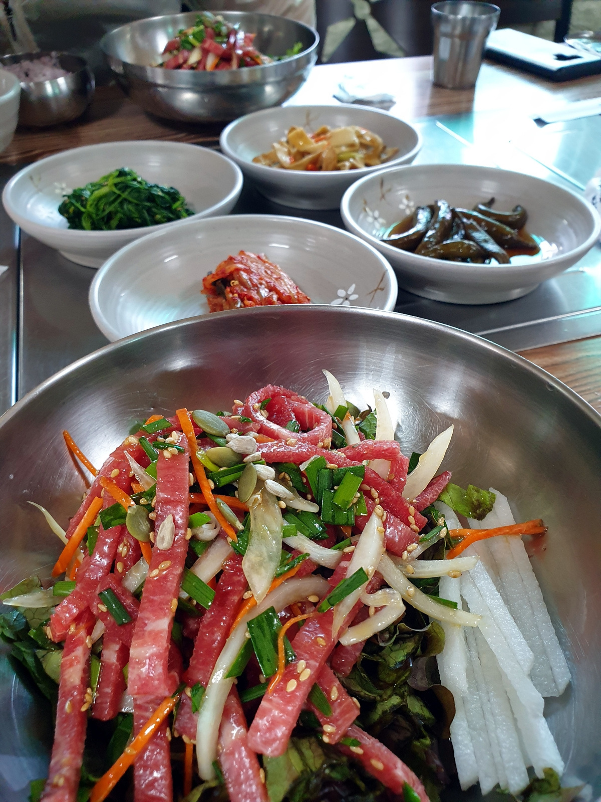 오후에는 횡성 버추얼 챌린저 1코스를 타기로 했다. 출발점인 횡성 운동장이 있는 횡성 읍내는 서원면에서 15km 정도 떨어져 있는데 5번 국도와 6번 국도가 만나는 구간을 자전거로 왕복하긴 싫으니 다시 자전거를 차에 싣고 횡성 읍내로 간다. 오전에 겨우 30km를 탔더니 출발 전에 먹은 아침밥이 아직 안 꺼졌다. 그래도 1코스 중간에는 보급이 애매하니 점심을 먹고 출발하기로 한다. 1코스 출발점인 횡성 운동장 가기 전에 가끔 들르는 식당에서 육회비빔밥을 먹는다. 여전히 먹을만한 식당이다. 참가비 1만 원을 내면 배번과 함께 지역 상품권 1만 원이 오는데 여기서 식사하면서 사용한다.