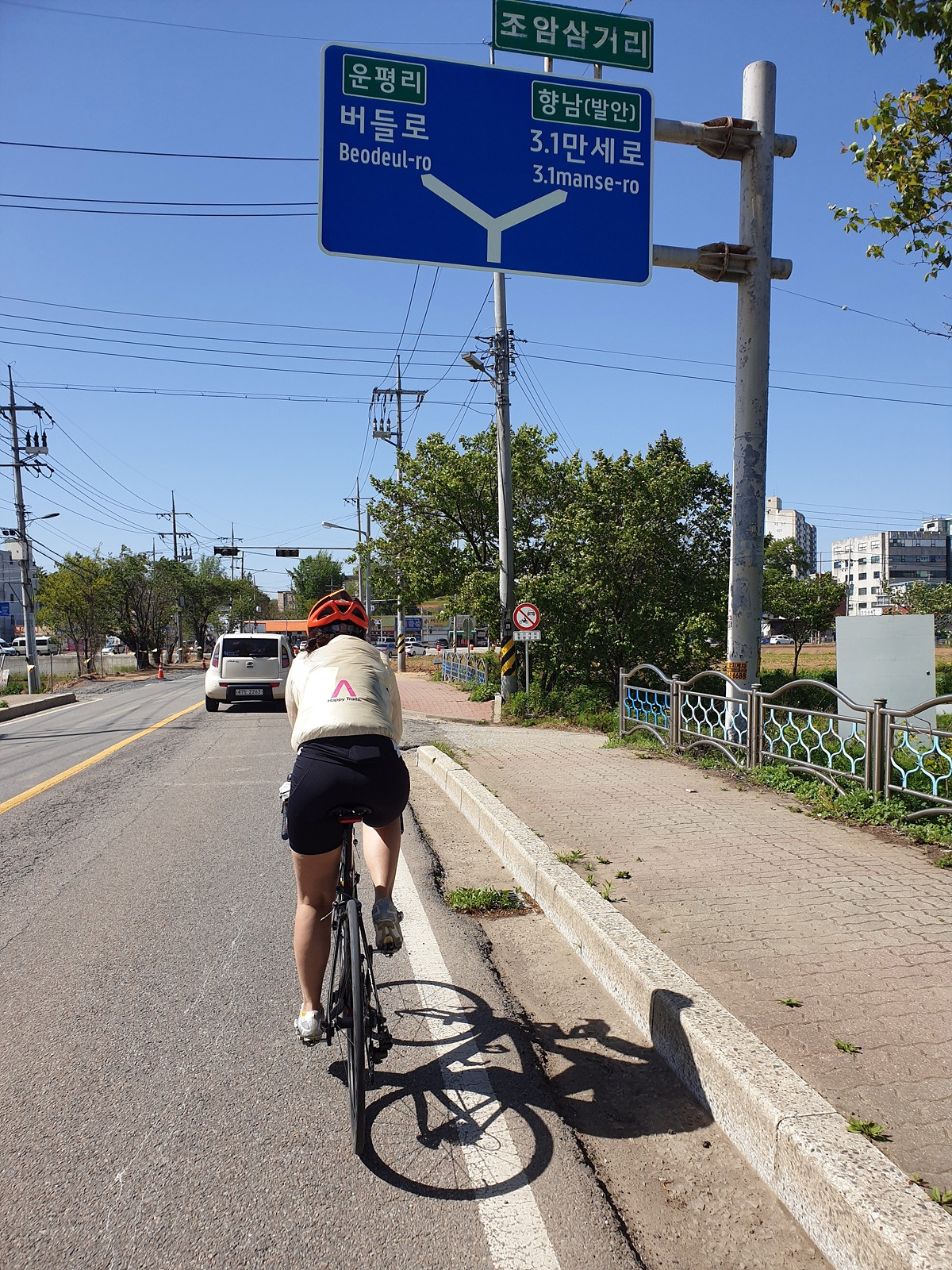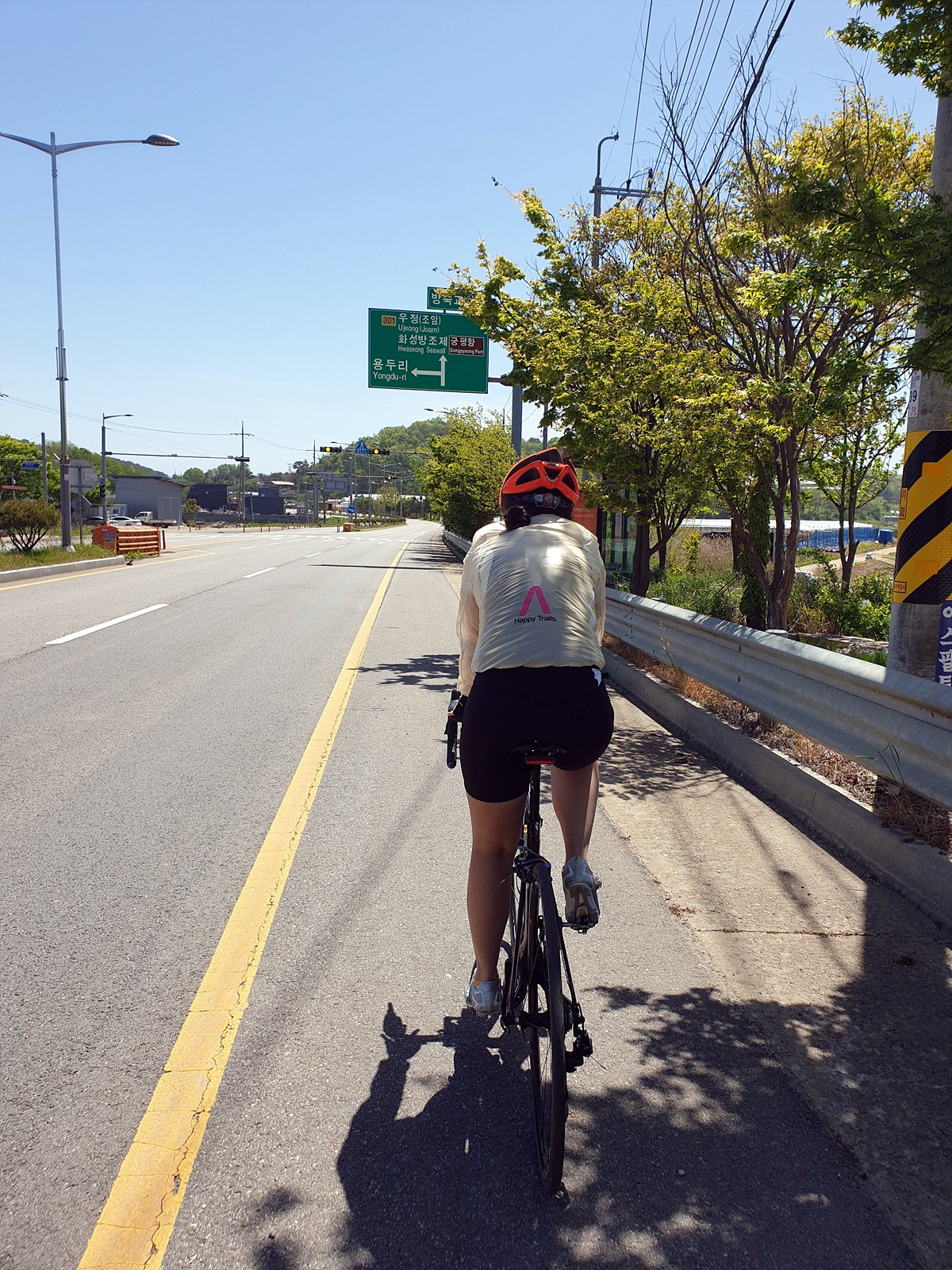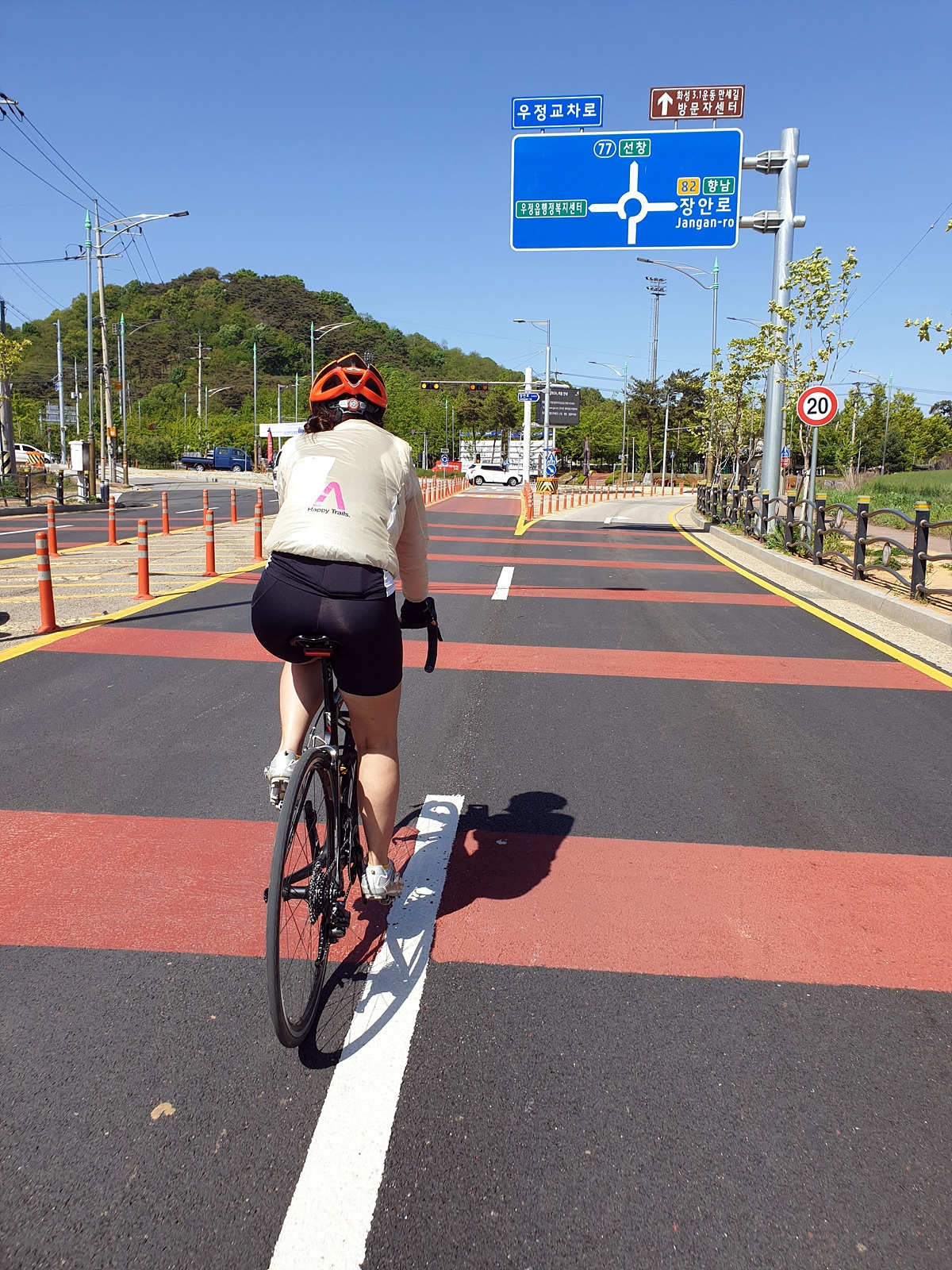 지금까지와 마찬가지로 자전거길 겸 보행로를 달려도 괜찮지만 도로도 차 없는 넓은 2차선이라 도로로 달려도 좋다.