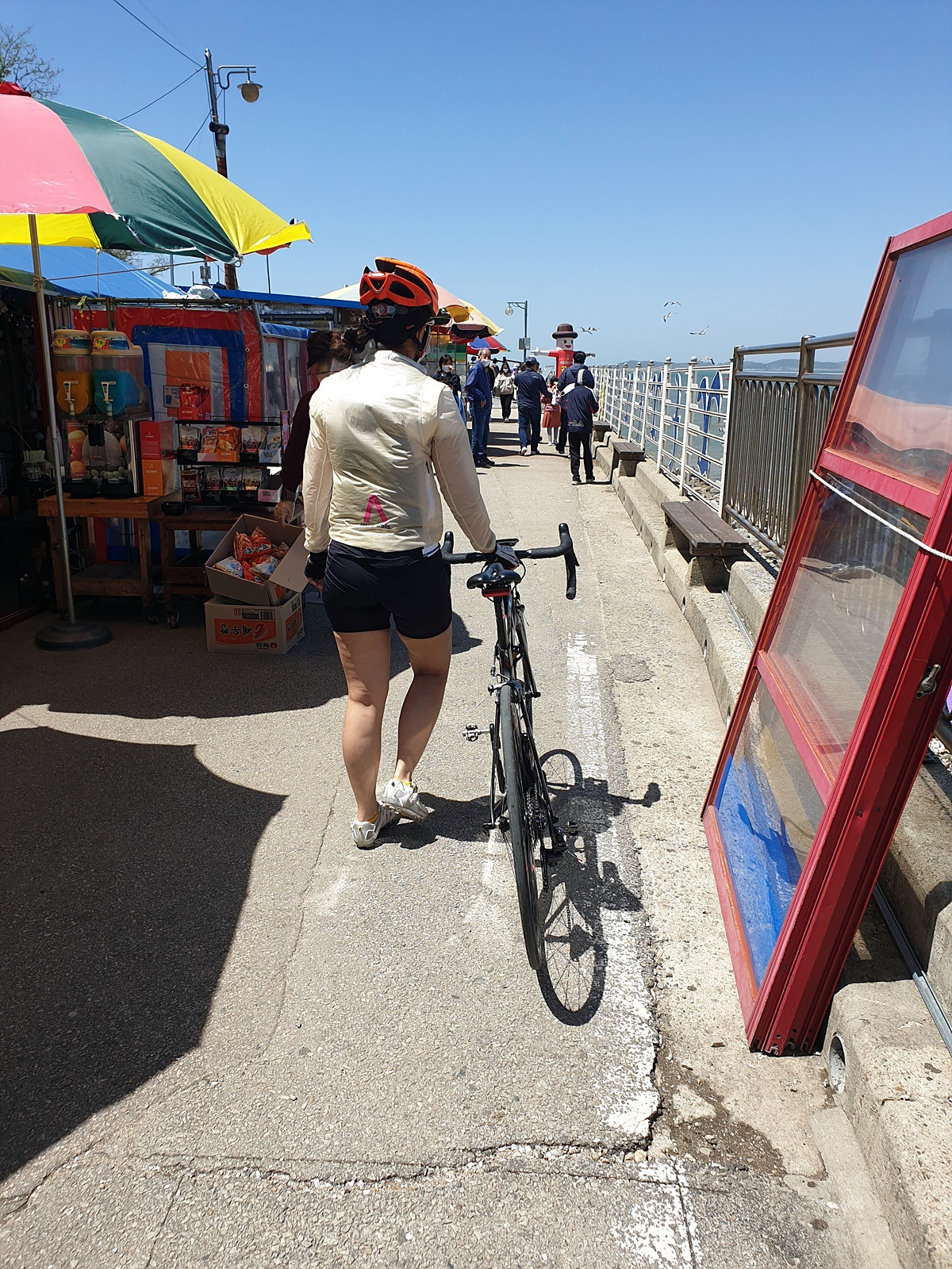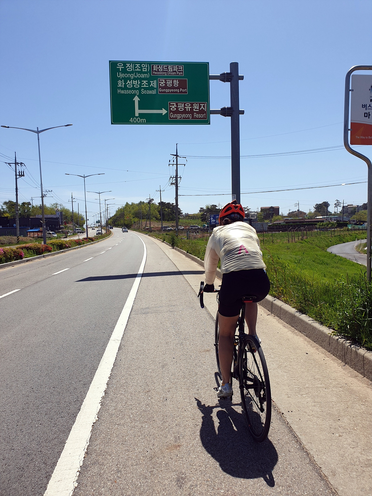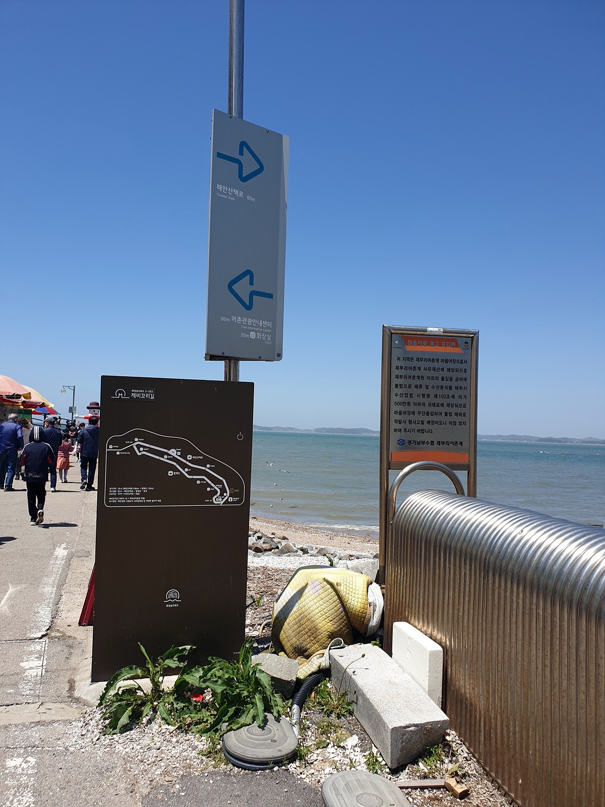 오늘은 궁평항도 난리다. 갓길은 차들이 빼곡하게 주차해 있고 궁평항으로 들어가려는 차들이 잔뜩 밀려있다. 오늘은 궁평항 쪽으로 들어가진 않기로 했으니 다행이다. 궁평항 입구 근처에 화성방조제의 레일 홈이 있는데 하필이면 레일이 사선 방향으로 지나간다. 자전거의 얇은 바퀴가 빠지지 않도록 주의해야 한다.