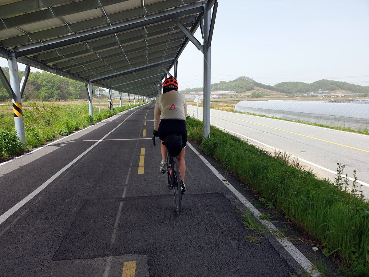 여기부터 송악저수지 쪽으로 질러가지 않고 일부러 돌아가는 이유인 아산 폐철길 자전거도로가 시작된다. 이용하지 않게 된 철길에 자전거도로를 만들고 태양전지판으로 지붕을 만든 멋진 자전거길이다.
