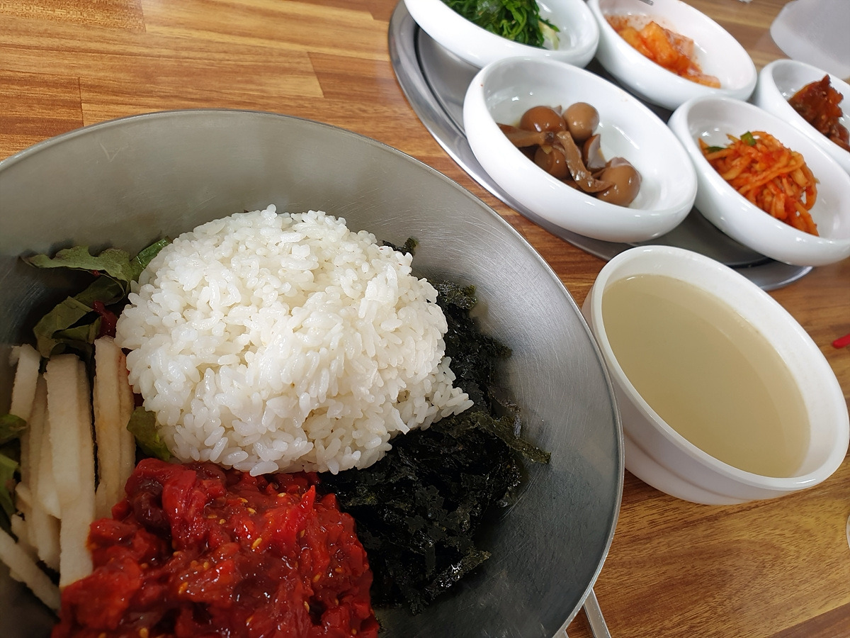 삼거리에서 육회를 전문으로 하는 식당을 찾았다. 얼른 들어가서 육회비빔밥을 두 그릇 주문한다. 한우 암소인지는 잘 모르겠지만 육회도 맛있고 밑반찬도 좋다. 한 끼 든든하게 잘 먹었다.