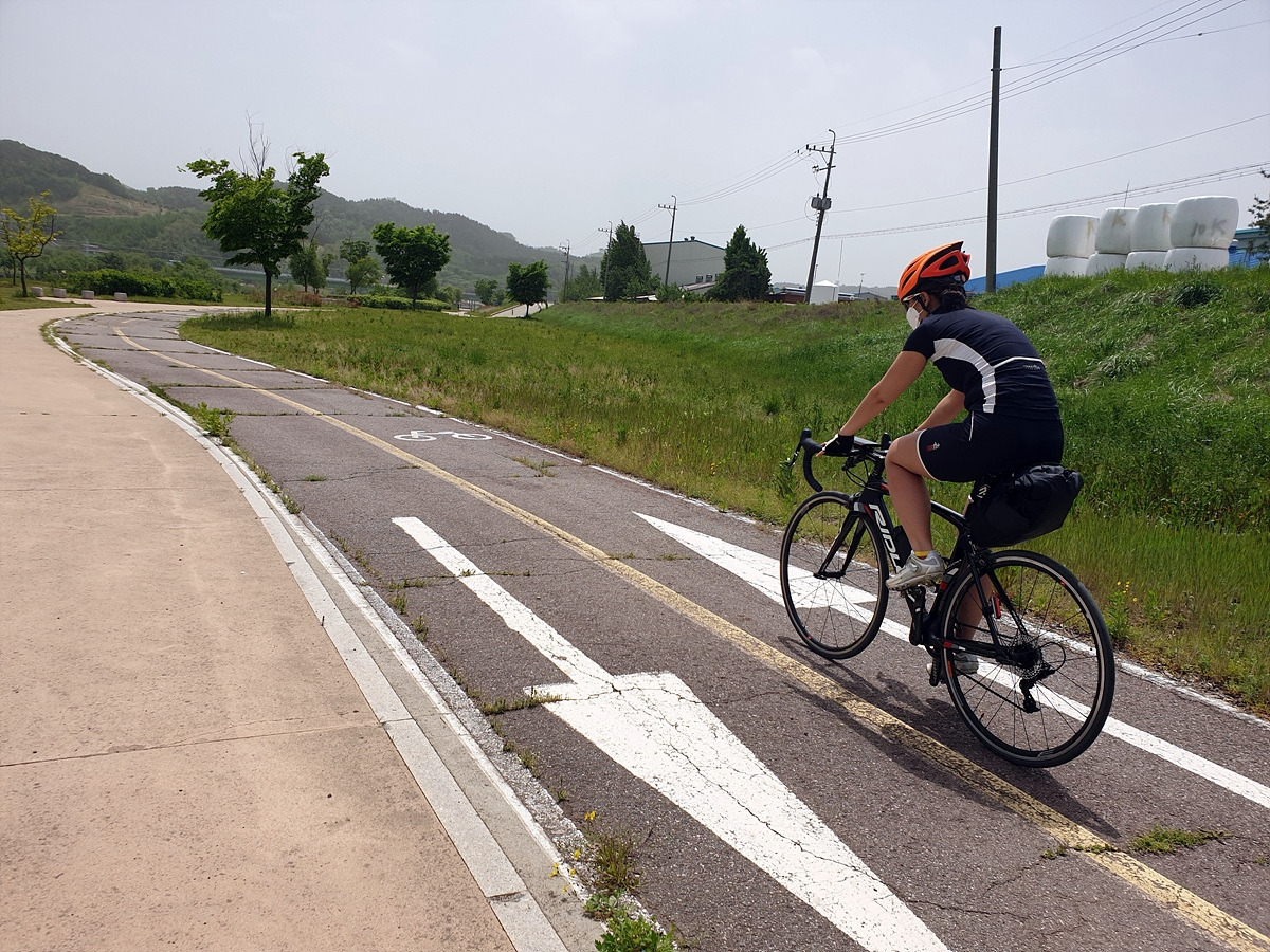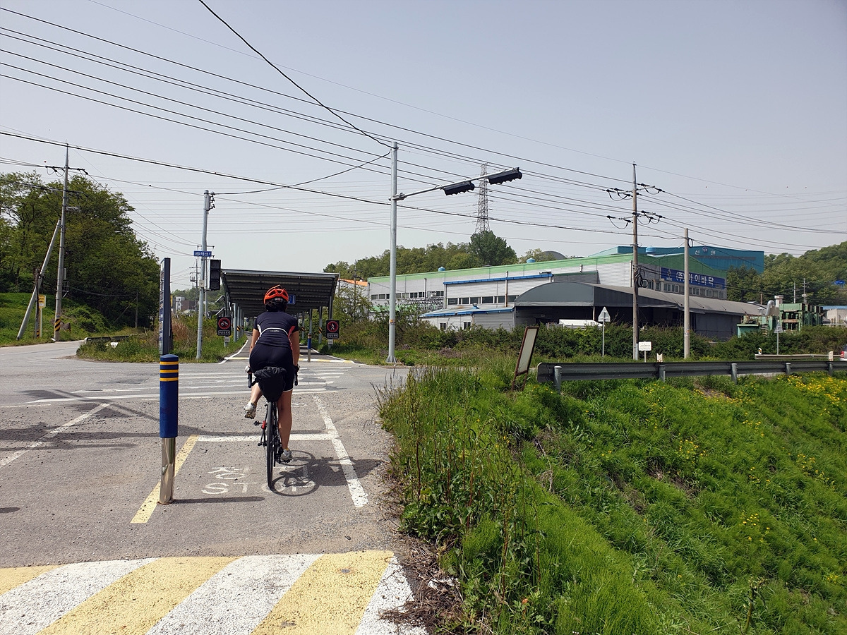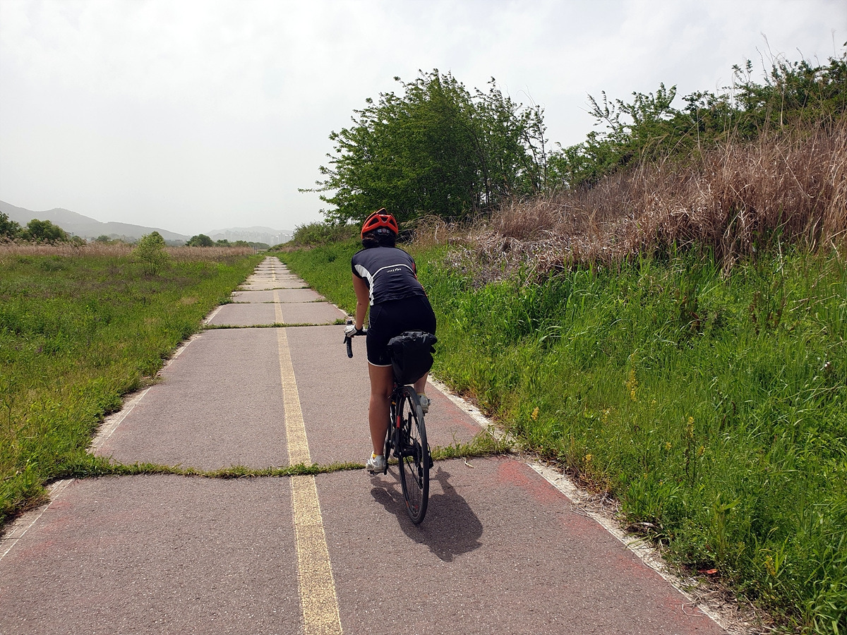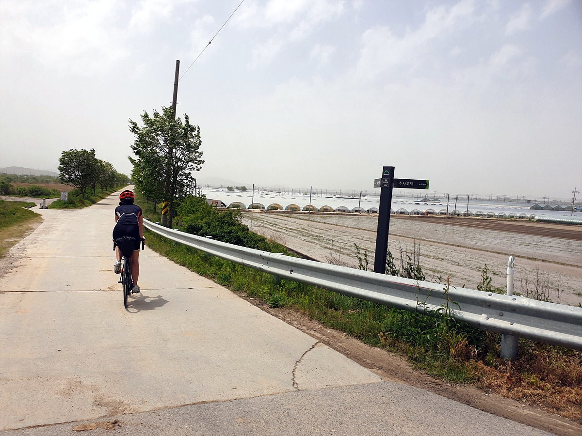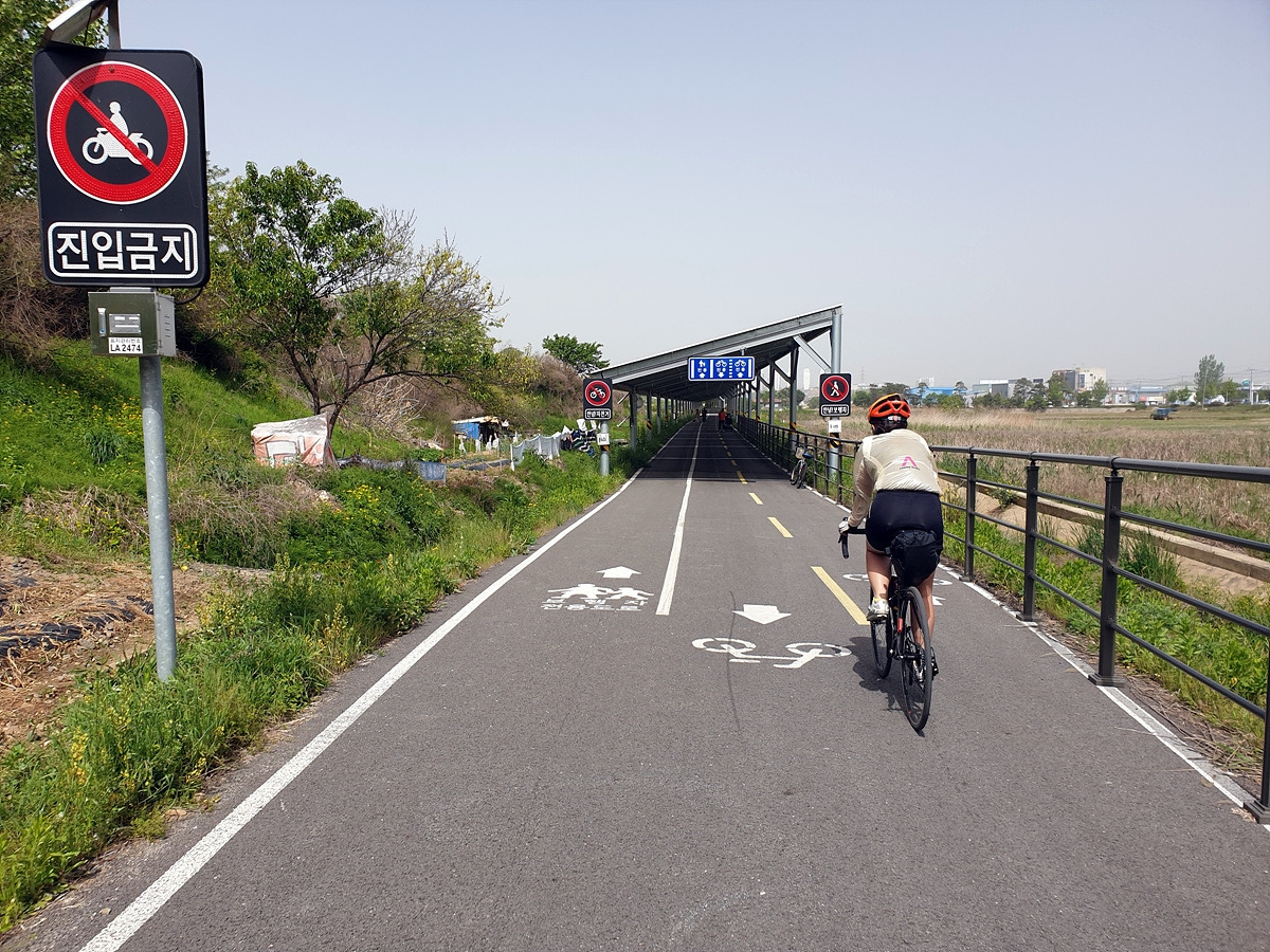 아침식사도 해결했으니 이제 출발이다. 아산 쪽의 1호선 전철길 아래에는 자전거길이 이어진다. 일단 이 길을 그대로 따라가면 된다. 사실 대천 쪽으로 빠르게 가려면 송악저수지와 광덕산을 지나가면 되는데 편하게 가려고 일부러 조금 돌아간다.