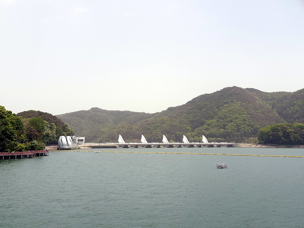 도로 끝에 이상한 뾰족 구조물들이 보인다. 예당저수지의 수문이다.