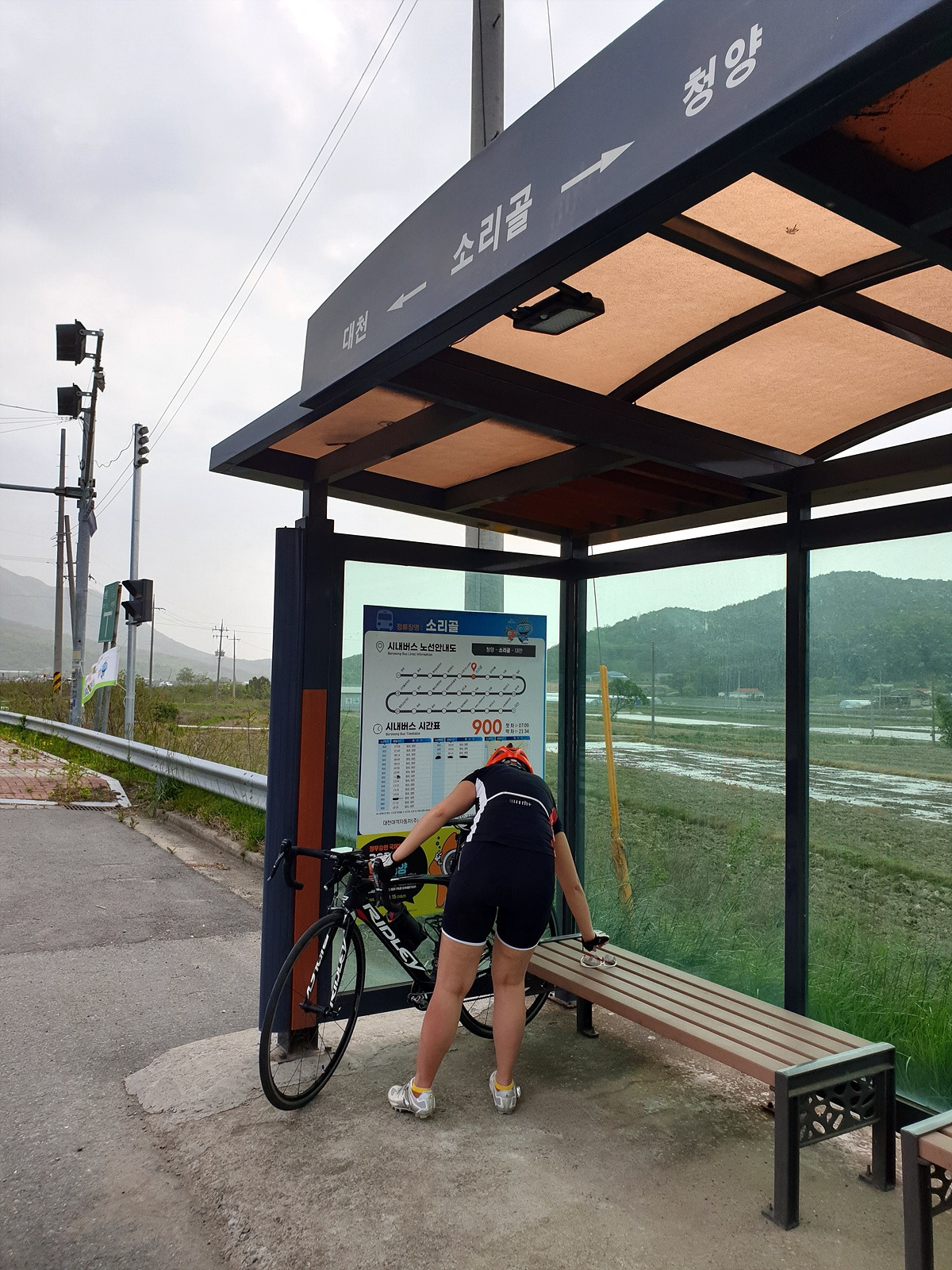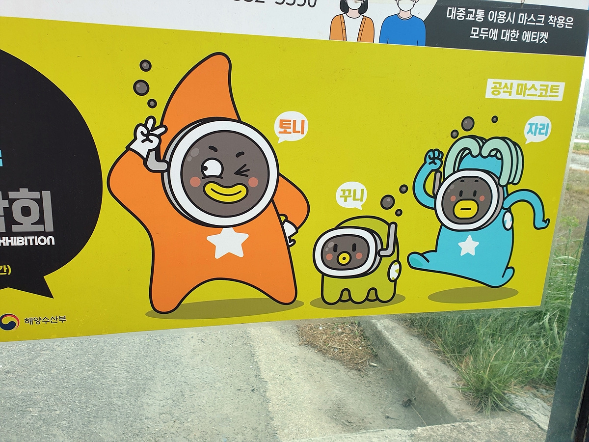 또 맞바람에 지쳐 중간에 쉰다. 버스정류장에서 바람을 피하면서 보니 보령머드축제 마스코트가 있다. 다 와가긴 하나보다.