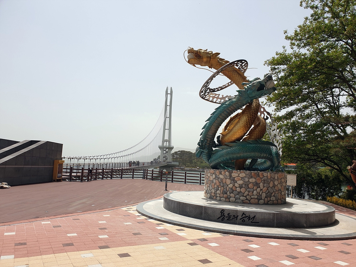 저수지길을 달리려다가 출렁다리 입구가 보인다. 다음에 언제 다시 여길 올지 기약이 없으니 온 김에 들어가 보았다. 출렁다리를 생각보다 크게 지어놨다. 앞의 용 조형물은 예당저수지에 얽힌 용의 승천 이야기를 담은 조형물이다.