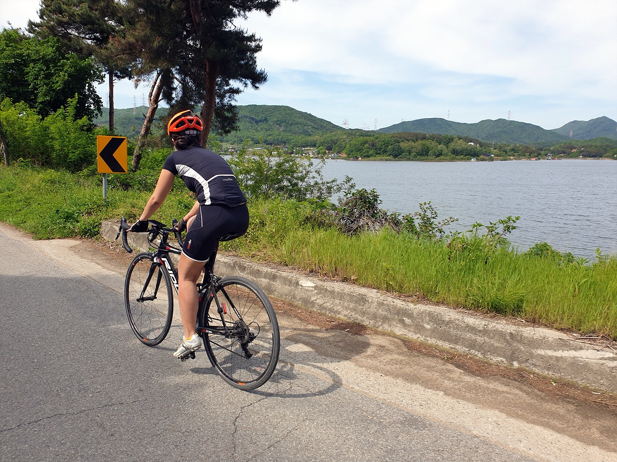 고삼호수의 북쪽 길인 70번 국도는 길이 좁은데도 차들이 많이 다닌다. 아마 오늘 전체 경로에서 가장 차량통행이 많은 구간일 것이다. 차들이 없다면 비석섬과 팔자섬의 풍경을 여유 있게 즐길 수 있는 곳이지만 차들과 함께 달려야 하니 앞만 보고 달린다. 여기서도 마을길로 빠지면 조금 돌아가긴 해도 좀 더 여유 있게 달릴 수 있다. 다음번에는 마을길로 빠져야겠다.