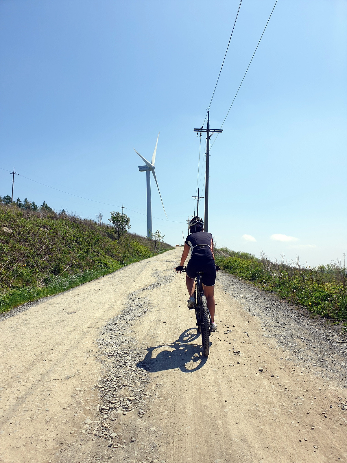 더운 날씨에 지니님보다 내가 먼저 퍼질 것 같다. 중간에 멈춰서 물을 마셨더니 지니님 혼자 저 멀리 가버린다. 풍력발전기들이 여럿 보이니 어느 정도 올라온 것 같다.