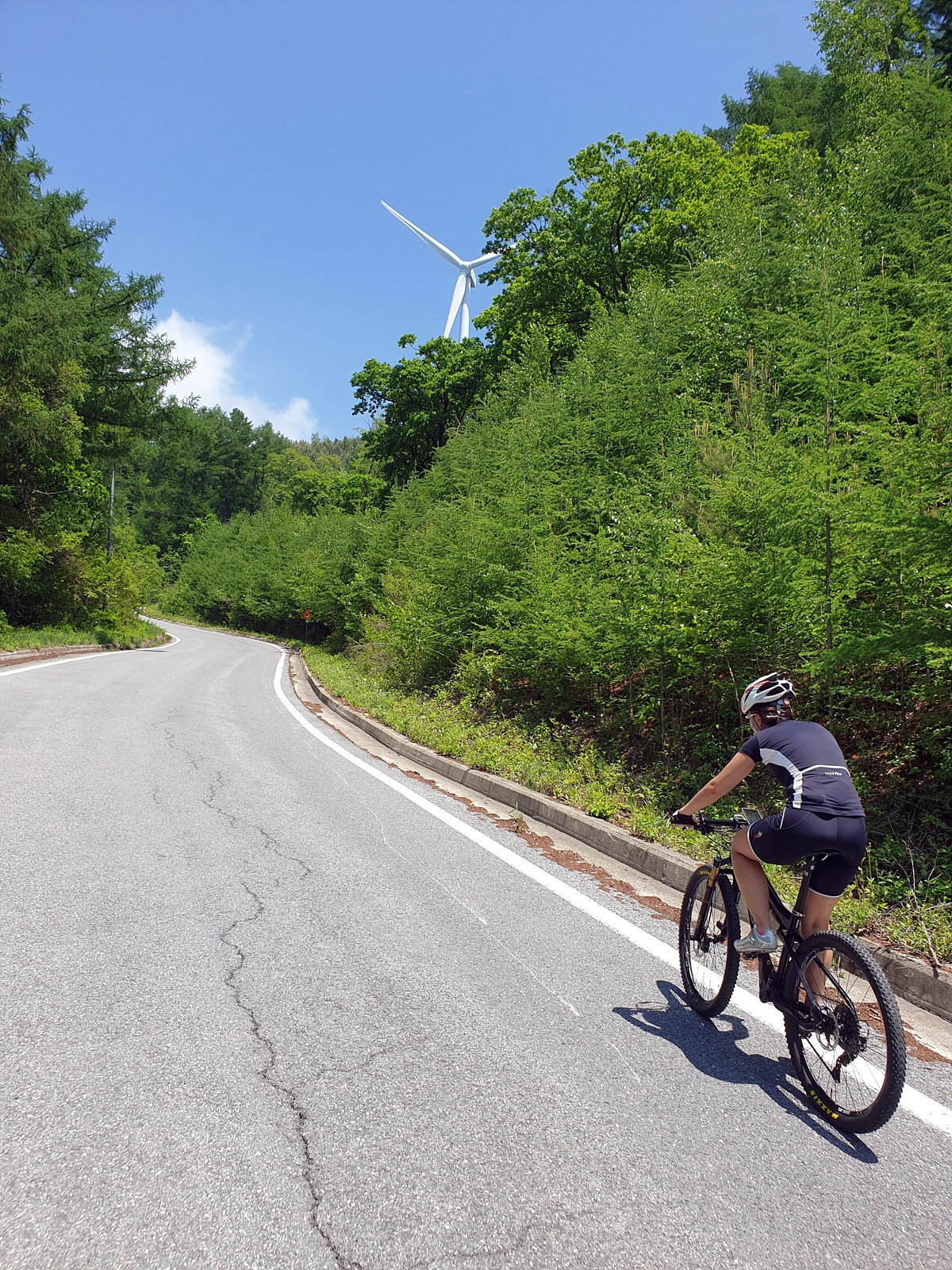 꼬불꼬불한 언덕길은 아무리 올라가도 끝이 보이질 않는다. 청옥산 풍력발전단지는 15기의 발전기가 넓은 간격으로 줄지어 있기 때문에 발전기 하나가 보인다고 다 온 게 아니다.