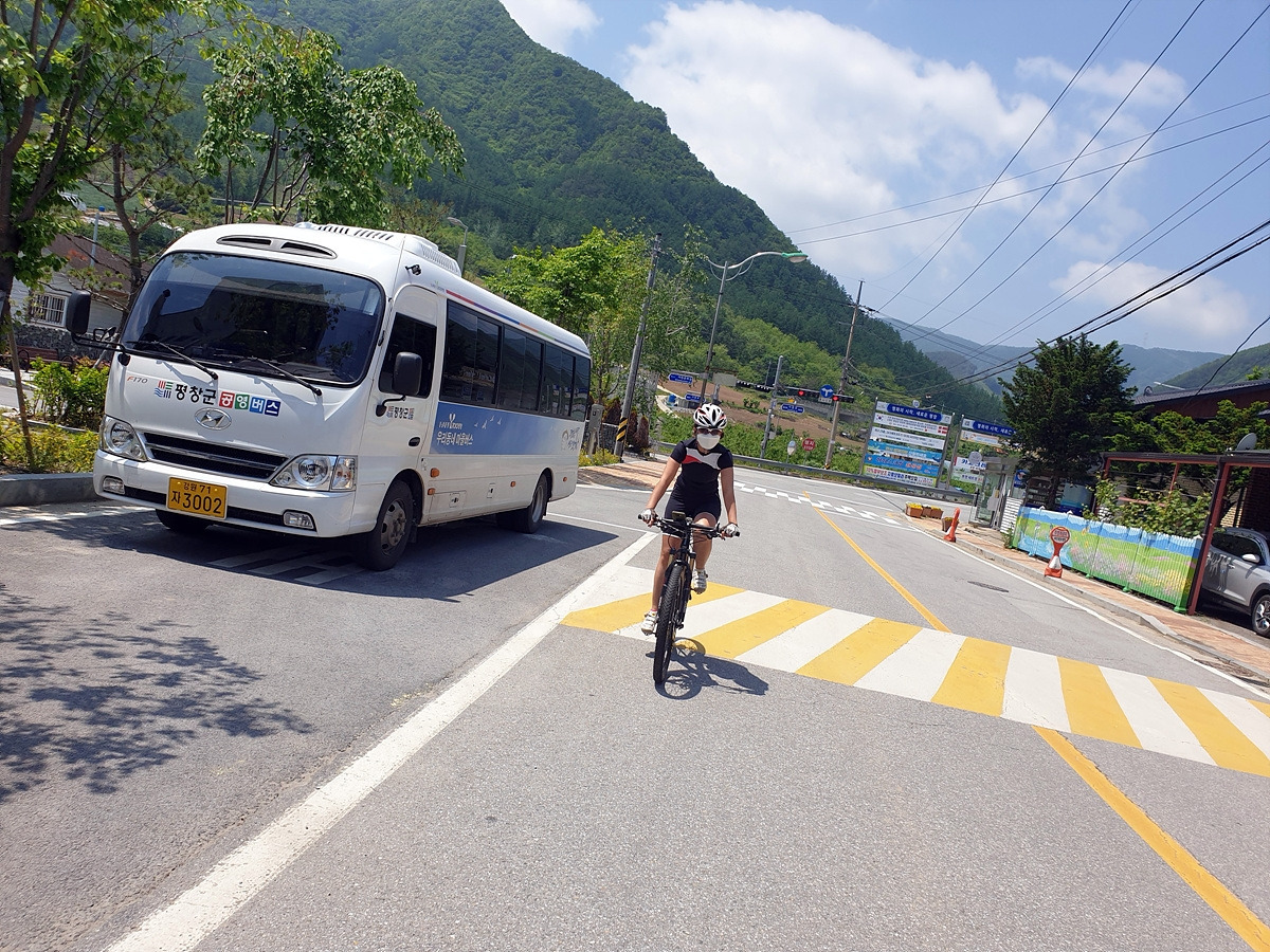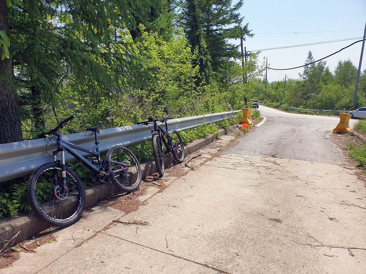 육백마지기 산악 라이딩은 산 아래 마을인 미탄면 읍내에서 시작한다. 늘 다니던 대로 면사무소에 주차하고 출발하려 했더니 미탄면 사무소와 그 주변 건물들은 완전히 잠겨있어 아래 마을 중심의 버스 정류장 근처 주차장에 주차를 하고 출발 준비한다. 올 3월에 전체 정비를 맡겨놓은 자전거라 둘 다 아주 깨끗하다.