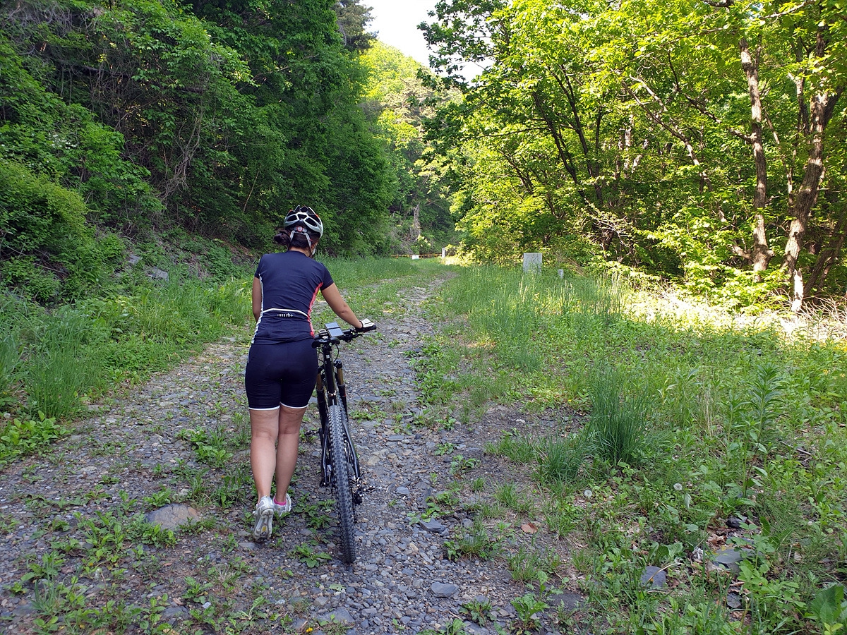 꾸불꾸불한 좁은 길을 내려가다 보면 널찍한 임도 입구가 나타난다. 넓다고 해도 고속으로 내려가다 보면 순식간에 지나치기 때문에 주의해야 한다. 지니님도 지나쳐서 내려갈 뻔하다가 도움닫기를 못하고 내려서 끌고 올라간다.