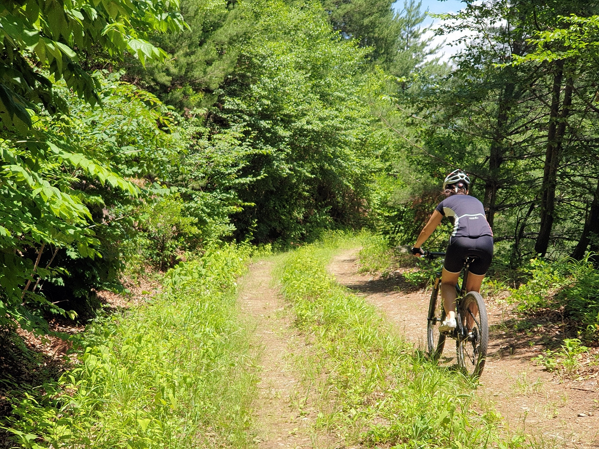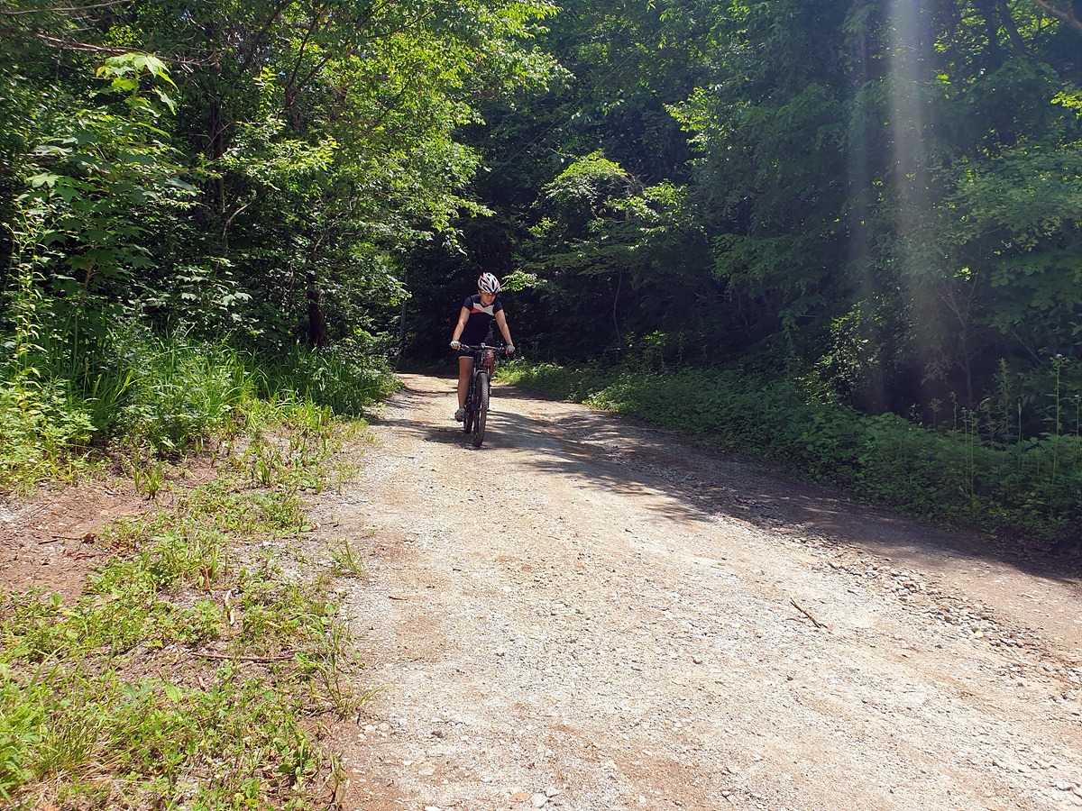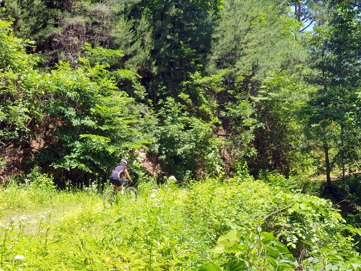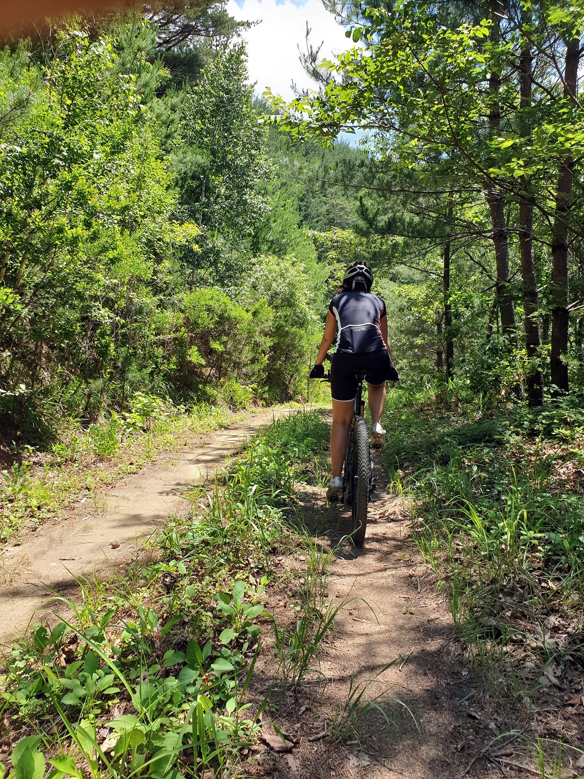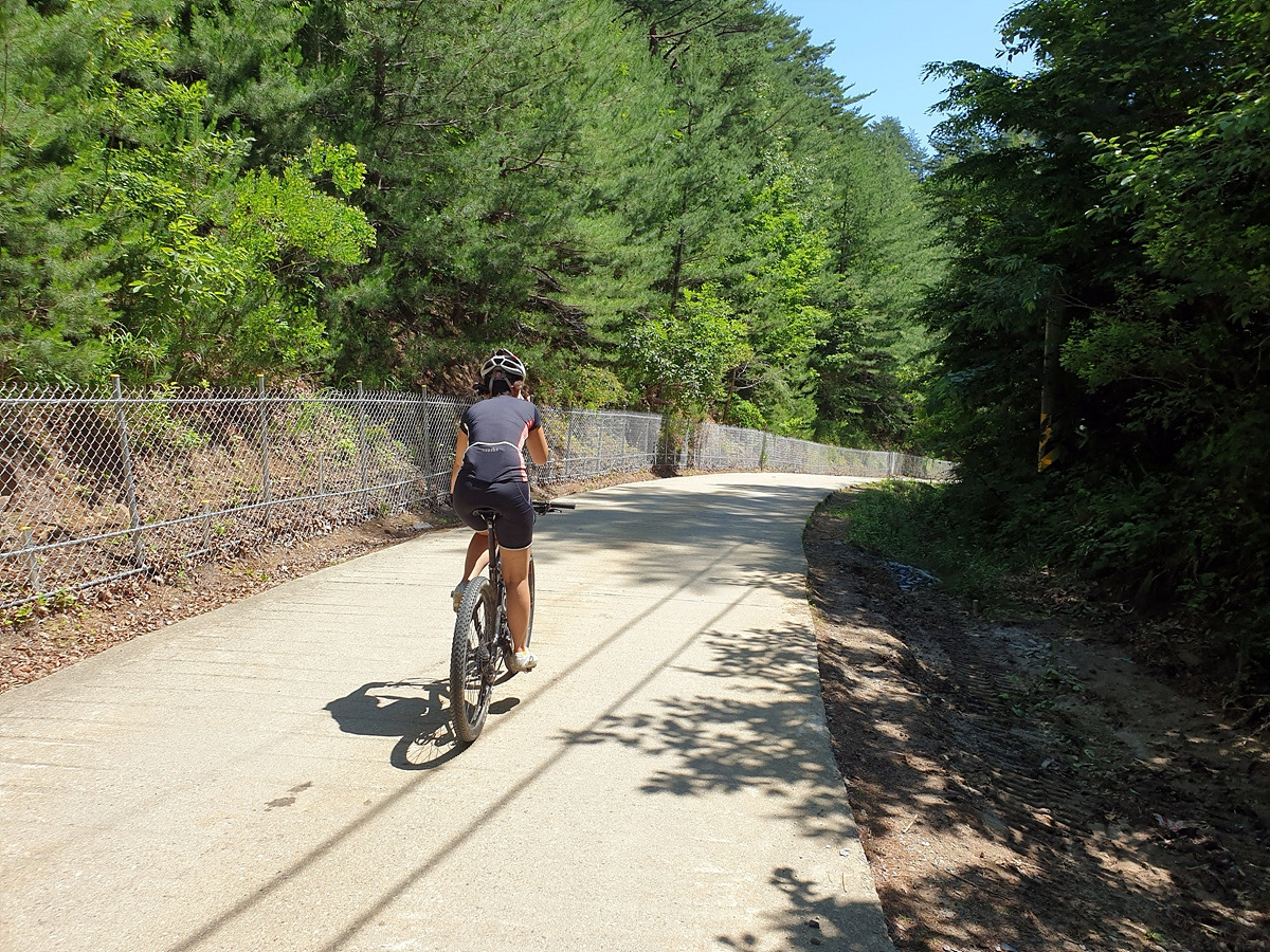 단축해서 바로 내려간다고 하니 지쳐있던 지니님도 좋아한다. 아까 내려온 임도 입구부터 계속 계곡을 따라 거의 내리막이기 때문에 그리 힘들지 않고 달릴 수 있다. 계곡 바람 때문인지 시원하다.