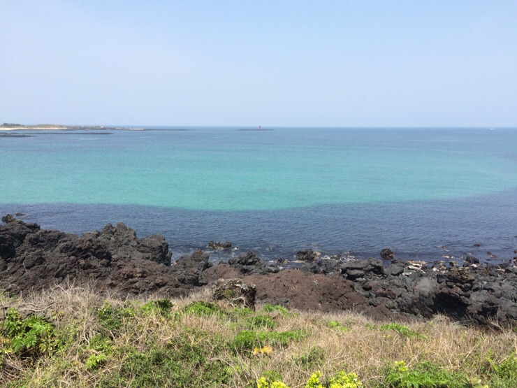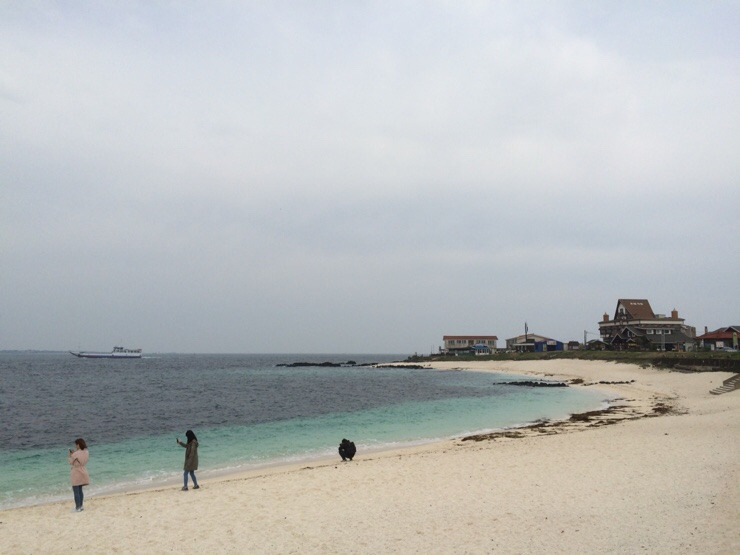 우도의 산호 해수욕장입니다. 바다 위의 배는 우도의 다른 항구인 하우목동 포구에서 성산 가는 배입니다.