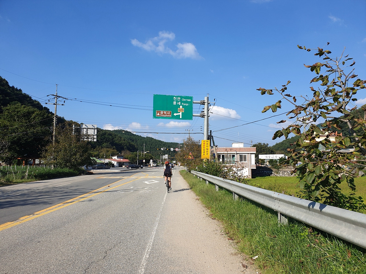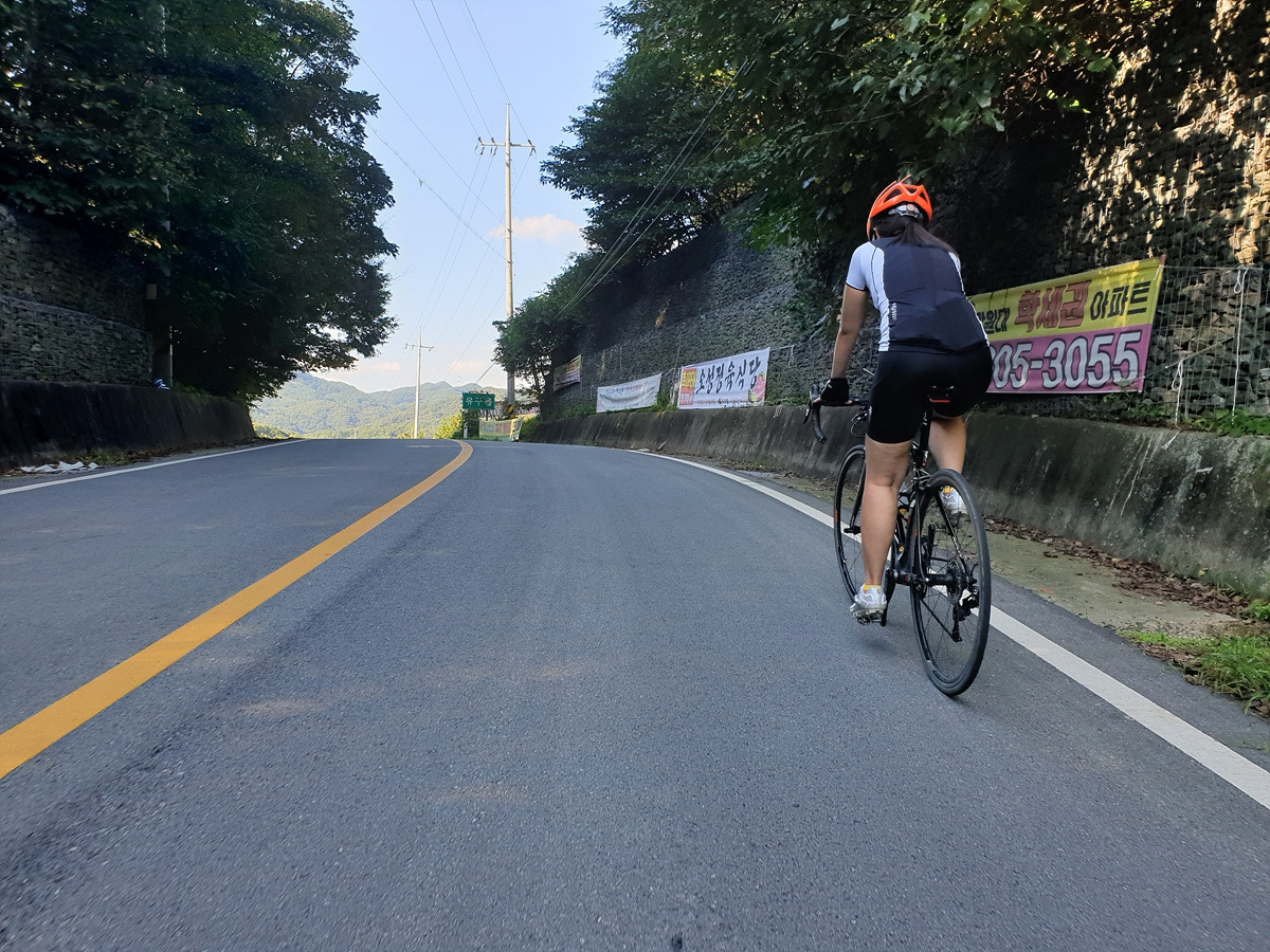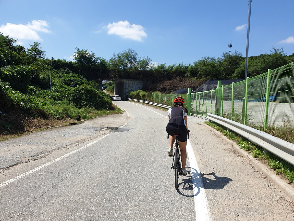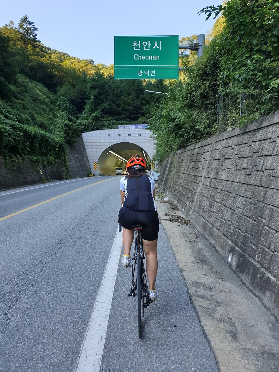 아무래도 광덕산을 넘어가야 하다 보니 언덕길이 조금씩 나타난다. 큰 언덕은 아닌 데다가 차량 통행도 얼마 없으니 천천히 올라간다.