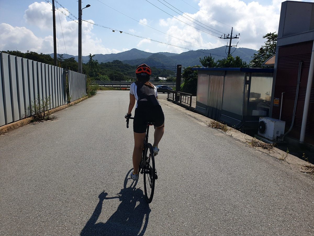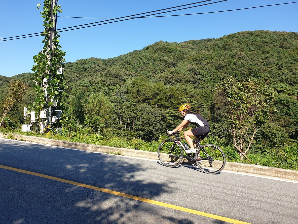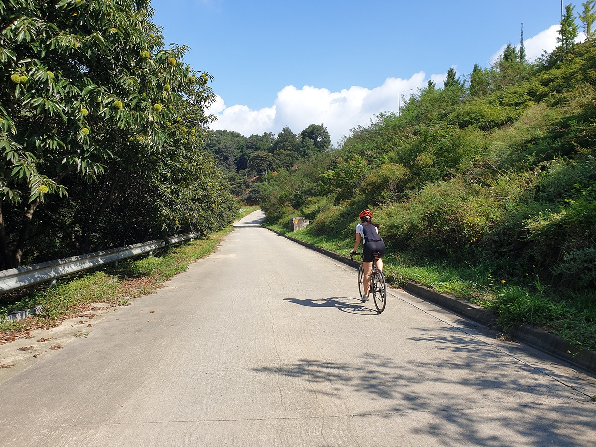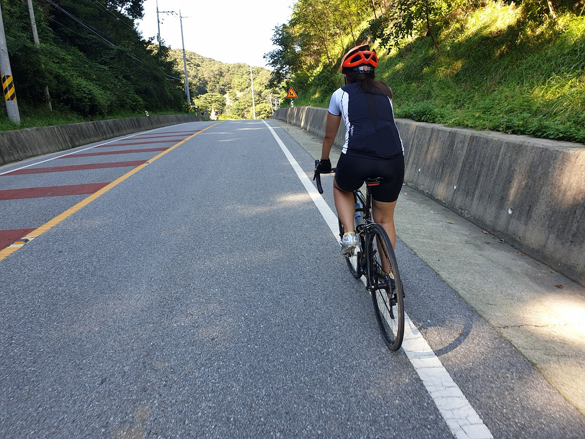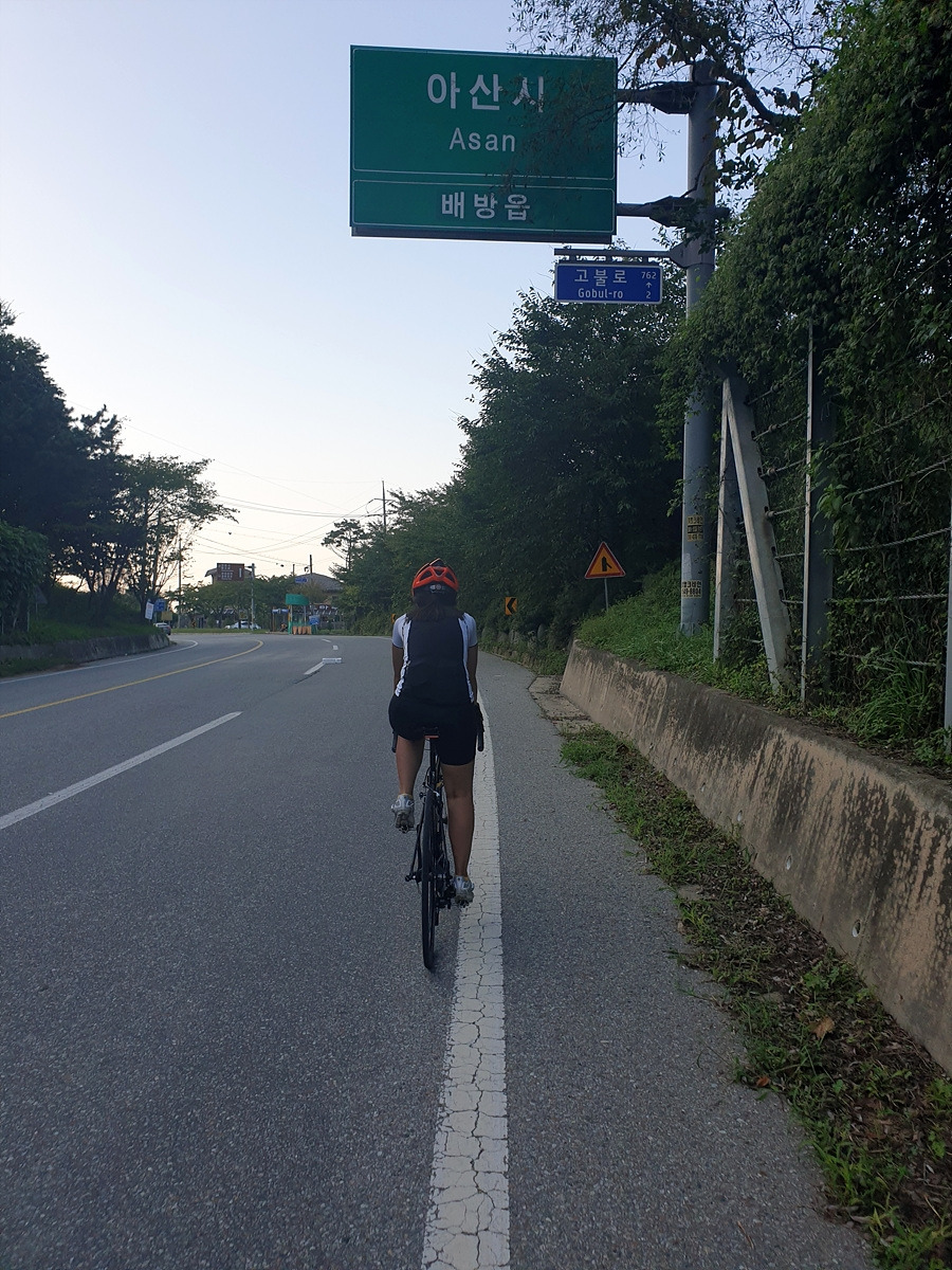 아무래도 광덕산을 넘어가야 하다 보니 언덕길이 조금씩 나타난다. 큰 언덕은 아닌 데다가 차량 통행도 얼마 없으니 천천히 올라간다.