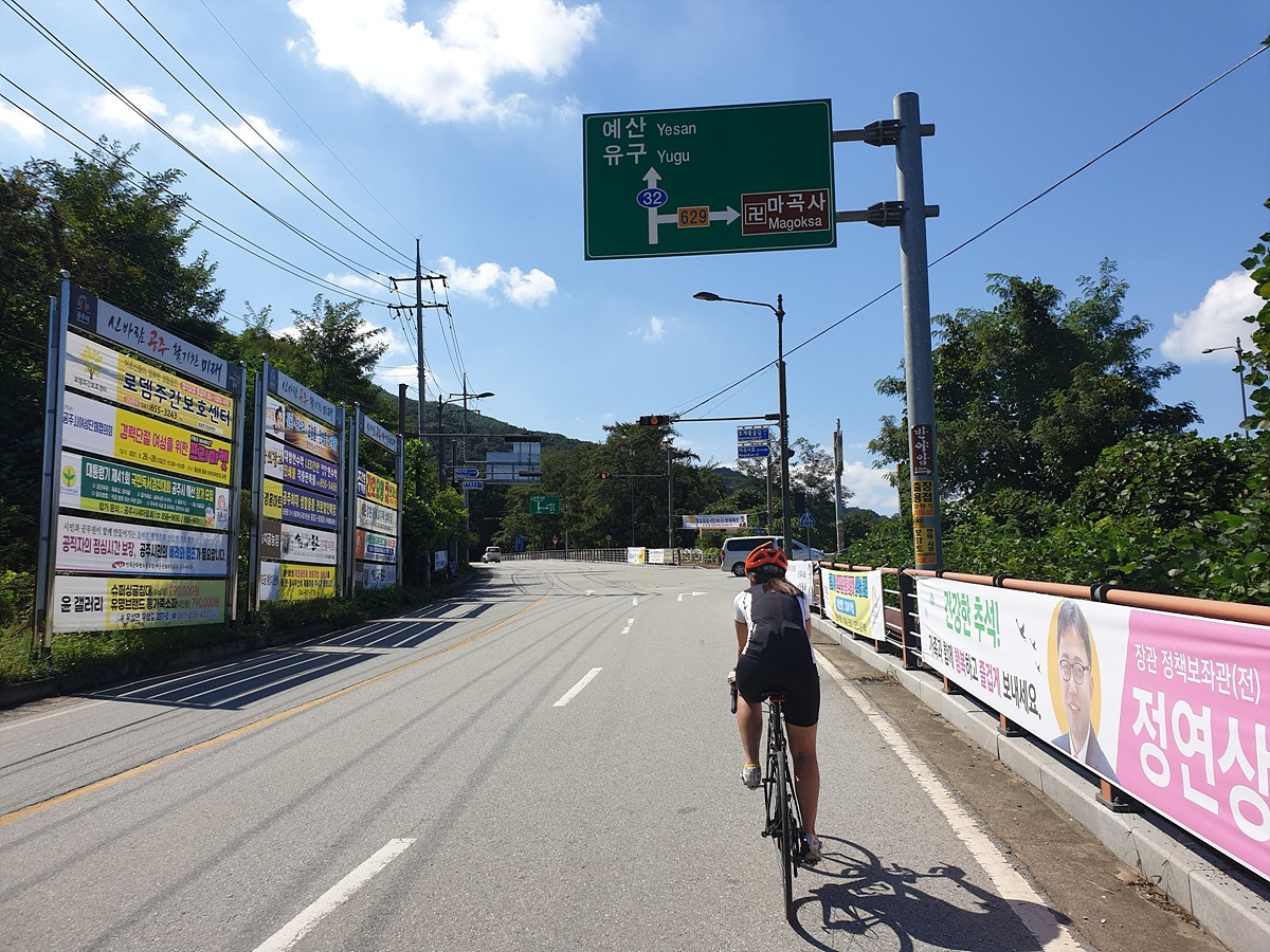 내리막길을 내려와서 큰길만 따라 쭉 달리면 마곡사 입구의 장승마을이 나온다. 마곡사는 백제 시기에 창건한 절로 백범 김구 선생이 은거하던 곳이라고 한다. 오늘은 시간이 없으니 들르지 않고 광덕산으로 간다.