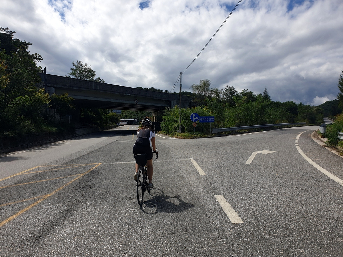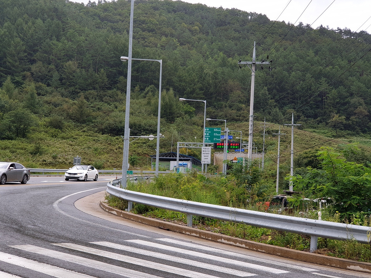사실 오늘 최대의 난관은 넛재가 아니다. 내리막길의 끝에서 다시 오르막이 시작될 때 노루재 터널이 시작된다. 터널은 길고, 길은 좁으면서 갓길도 여유가 없고, 차들은 많고... 여길 지날 때마다 정신이 없다. 우회할 수 있는 옛길 노루재가 있긴 하지만 그냥 다음부터는 안 오는 걸로 한다.