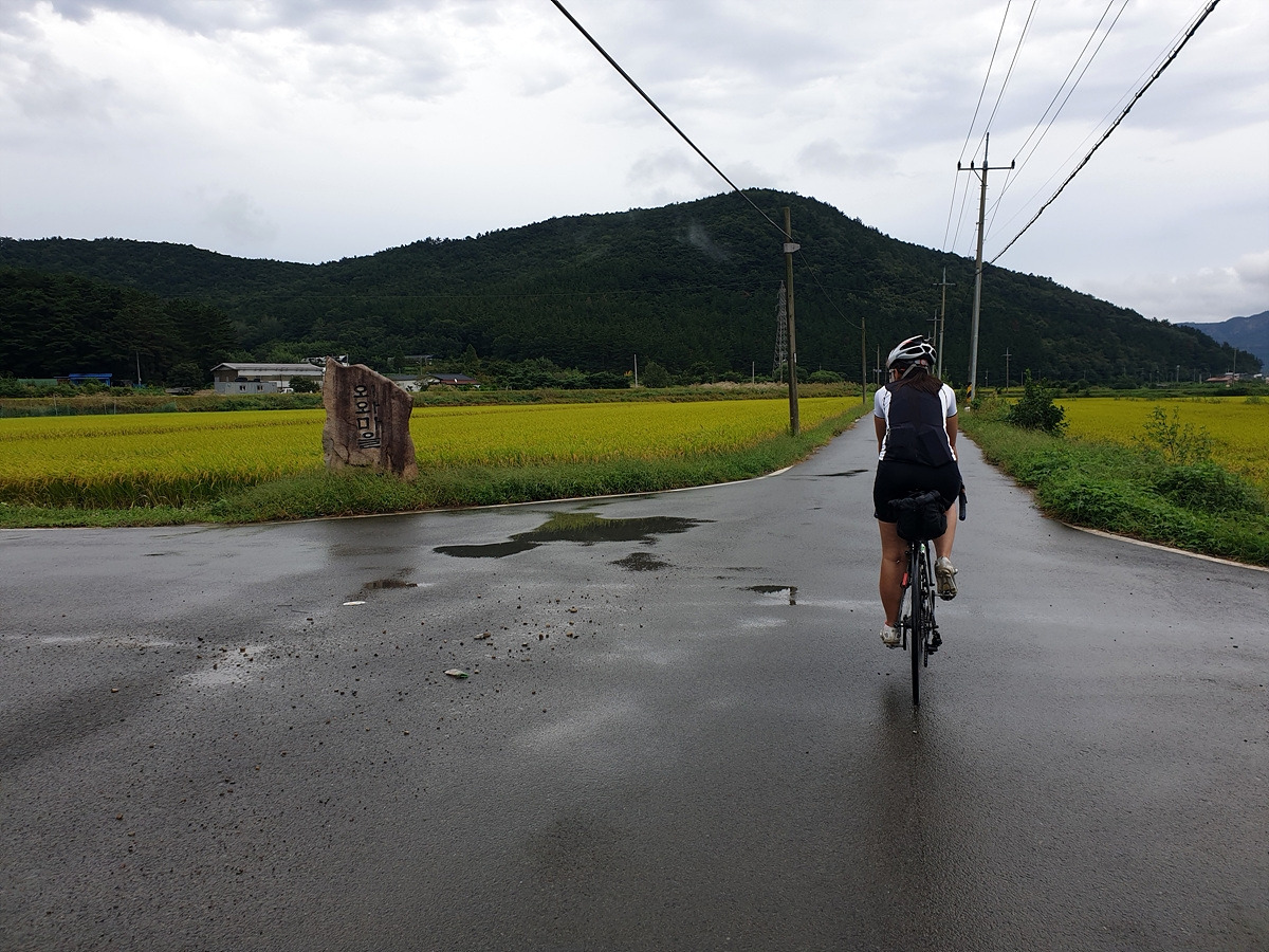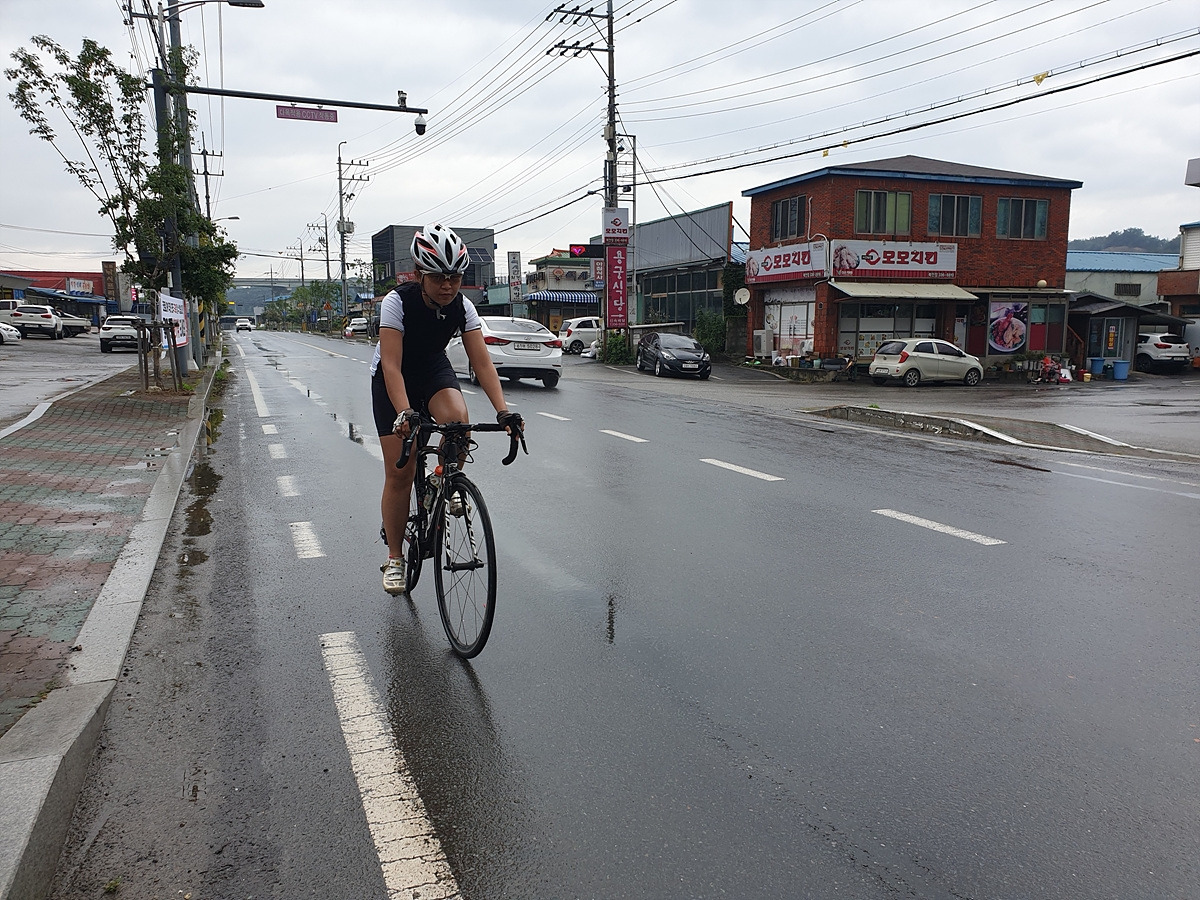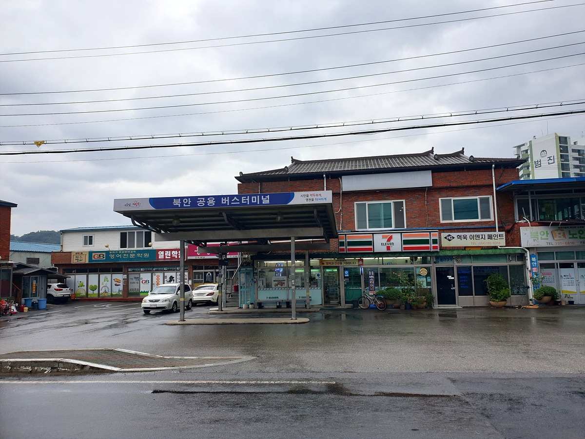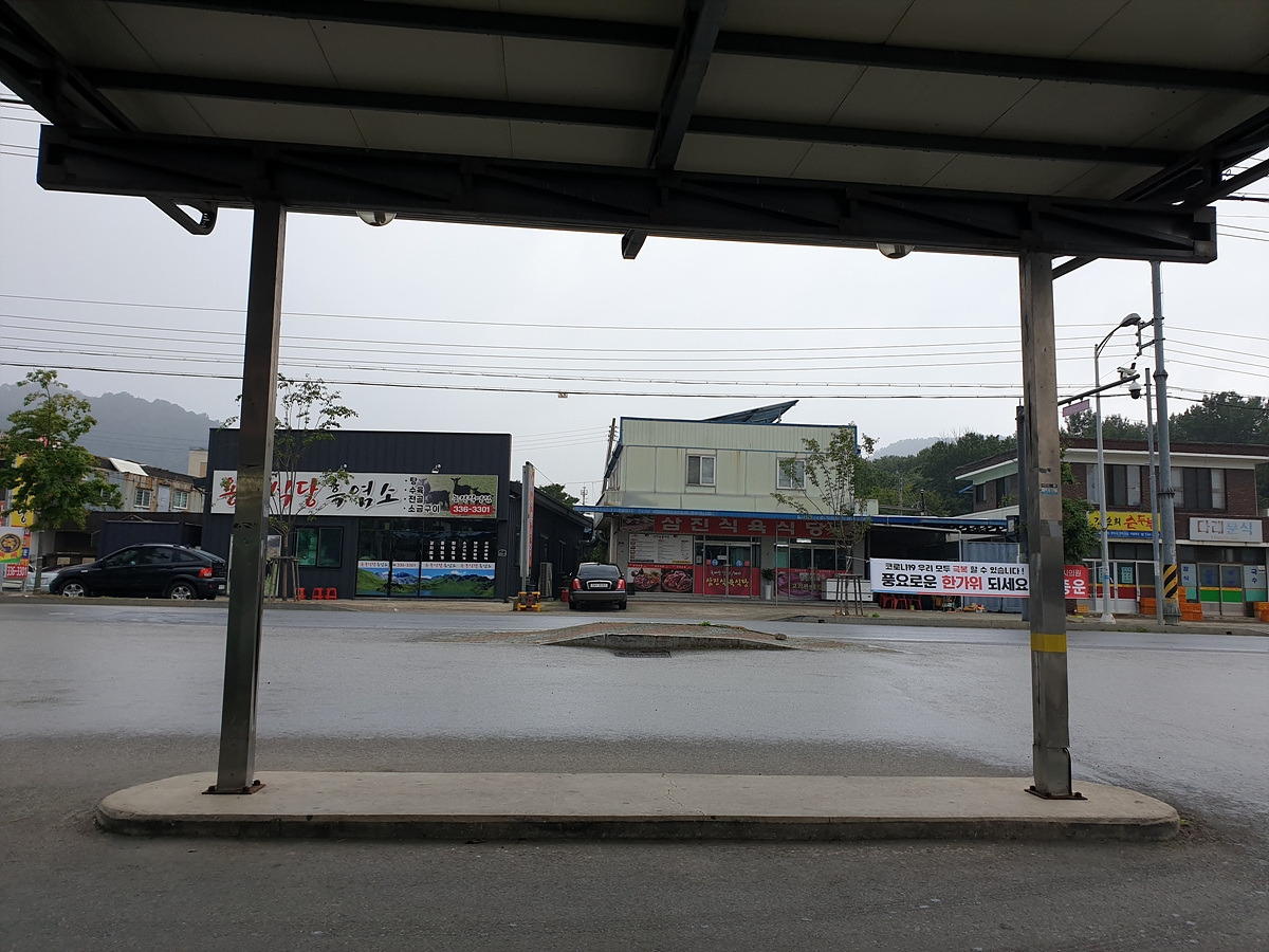 비를 그대로 맞다가 신발이 다 젖으면 끝장이다. 근처 북안면 버스 정류장으로 대피한다. 오늘은 달리는 거리도 길지 않으니 느긋하게 비가 지나가는 걸 기다리기로 한다.