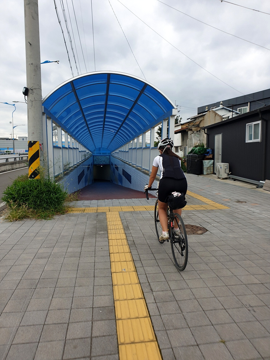 영천과 경주를 잇는 큰 도로는 경부고속도로와 4번 국도다. 당연히 오늘도 4번 국도 옆의 우회길로 달린다. 4번 국도 근처로 가려면 철길을 건너야 한다. 지하도로로 가려다는데 마침 인도 쪽에 자전거길이 있다.