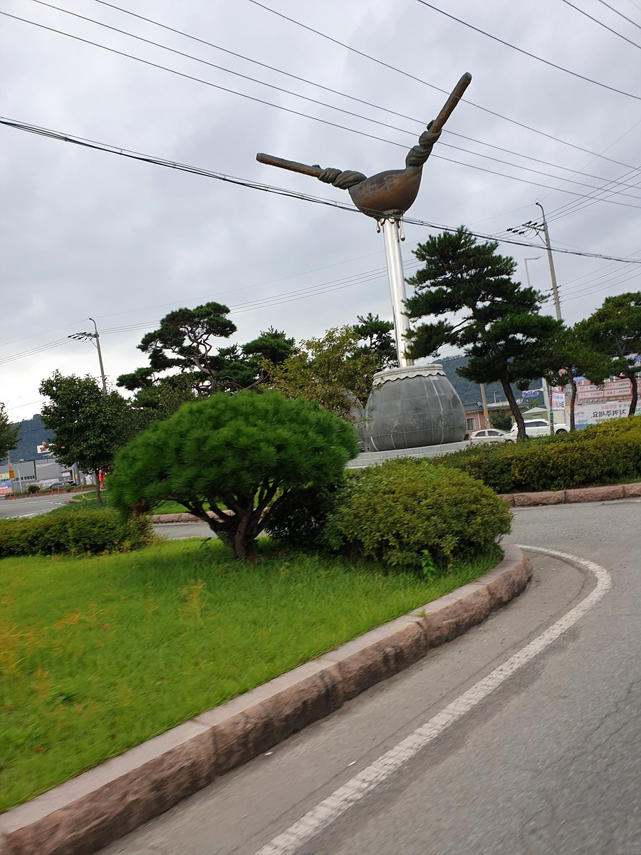도동네거리에서 직진하면 4번 국도로 들어가게 되니 좌회전해서 샛길로 가야 한다. 약대와 베보자기로 한약을 짜는 조형물이 있다. 바로 옆에 큰 한약재 시장이 있으니 이런 것을 만들어 놓았다. 지금은 압축기로 한약을 알뜰하게 짜지만 한약 하면 떠오를만한 것이 약 짜는 것인가 보다.