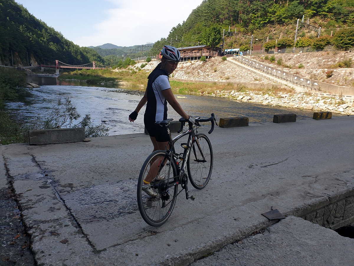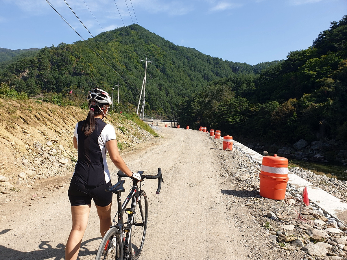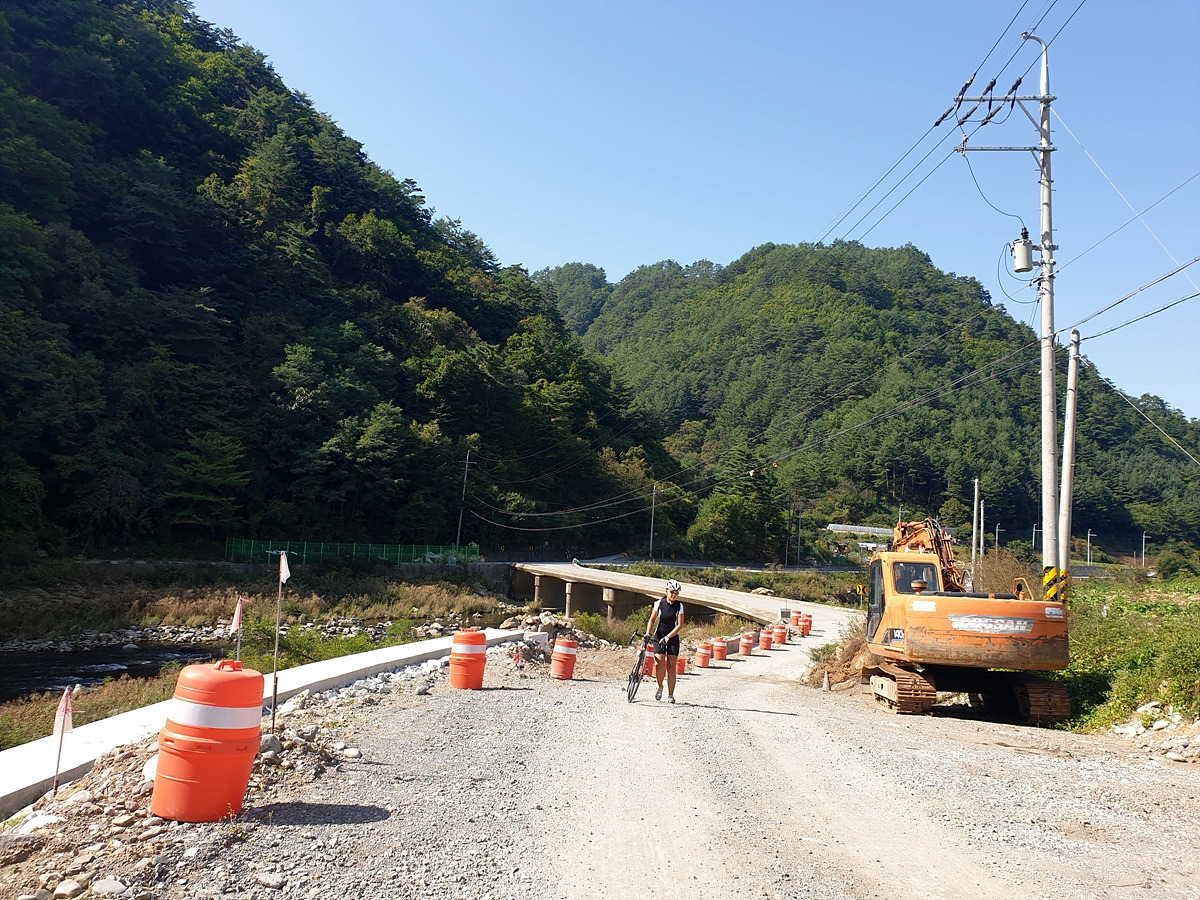 석포에서 승부 가는 길이 공사 중이다. 암기 1교부터 암기 2교를 지나 얕은 언덕까지다. 원래 작은 다리였던 암기 2교를 아예 새로 크게 놓는 중이다. 슬슬 걸어서 공사구간을 지나기로 한다. 이런 길일 줄 알았으면 MTB로 올 걸...